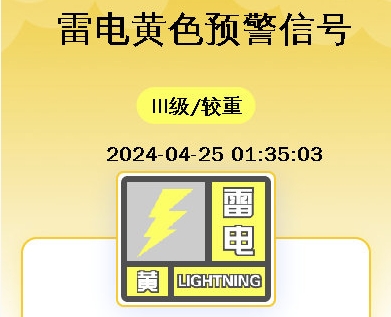 04月25日01时32分,厦门市气象台发布雷电黄色预警信号:预计未来6小时我市部分镇街及近海有雷电活动,局地伴有短时强降水和7~9级短时大风。请注意防范强对流天气对公众活动、安全生产等的影响。
