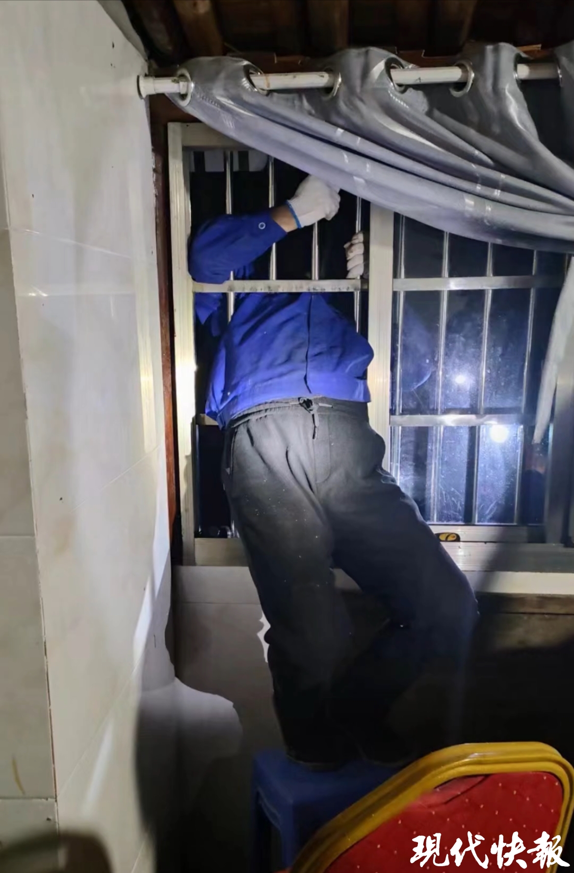 现代快报记者从常州武进警方了解到,4月18日晚上9点多回家时发现,自家一楼的窗户上卡了一个人,还在挣扎!“小偷?!”沈师傅吓了一跳,打开灯一看,只见一个身穿蓝衣黑裤的男子卡在防盗窗中间。“防盗窗上有两截不锈钢管被锯掉,就有了20多厘米见方的空子,小偷从这空子里钻进来,没想到卡在了腋窝、肋骨位置,进退不得。”沈师傅说,“应该是卡了好一会,自己折腾不出来,我一问他就主动承认是企图入户盗窃,让我帮他弄下来。”沈师傅立刻报警求助:“小偷卡在我家窗户上,让我救他!”这个电话让接警员都没反应过来,让沈师傅再说一遍。