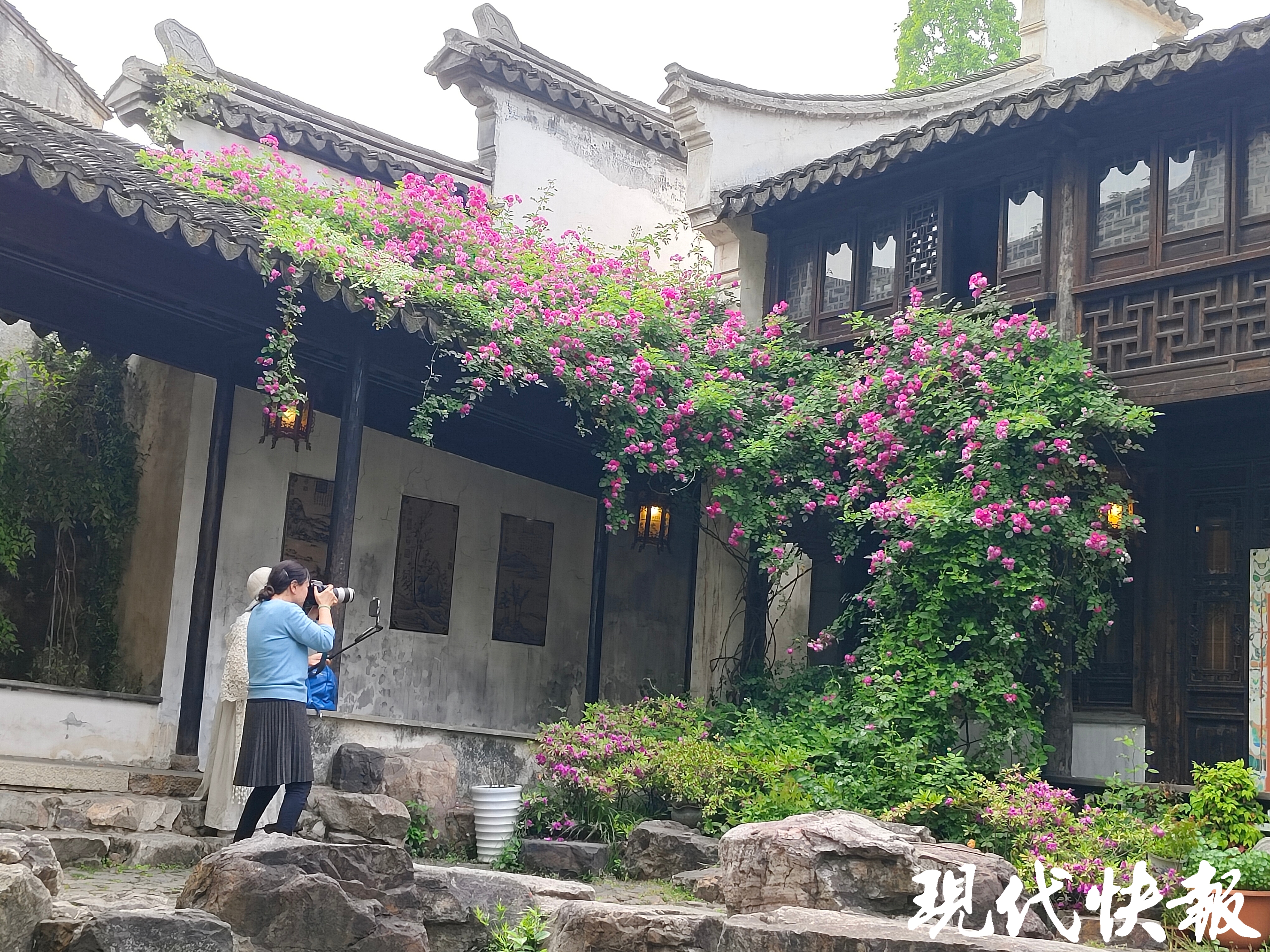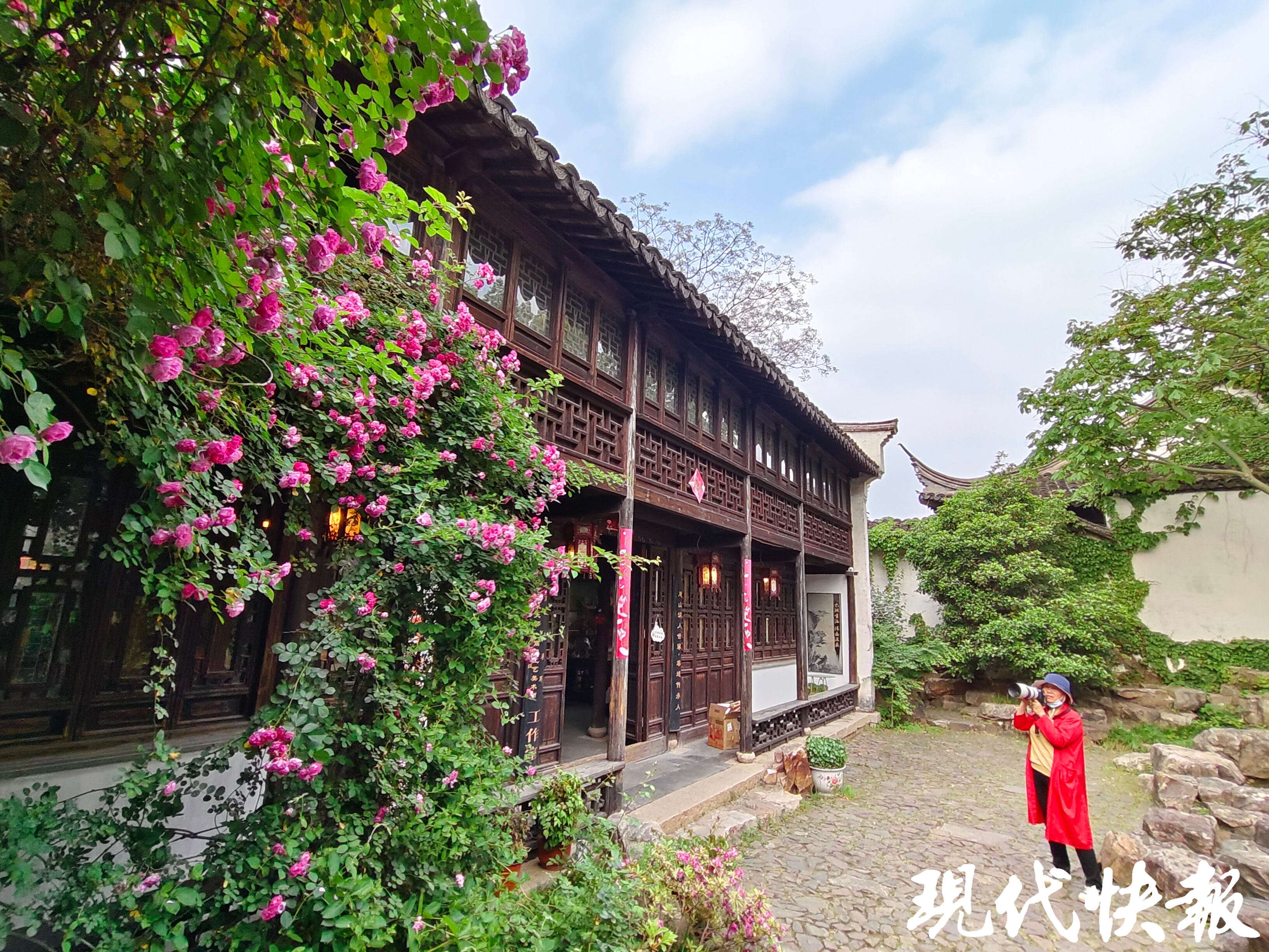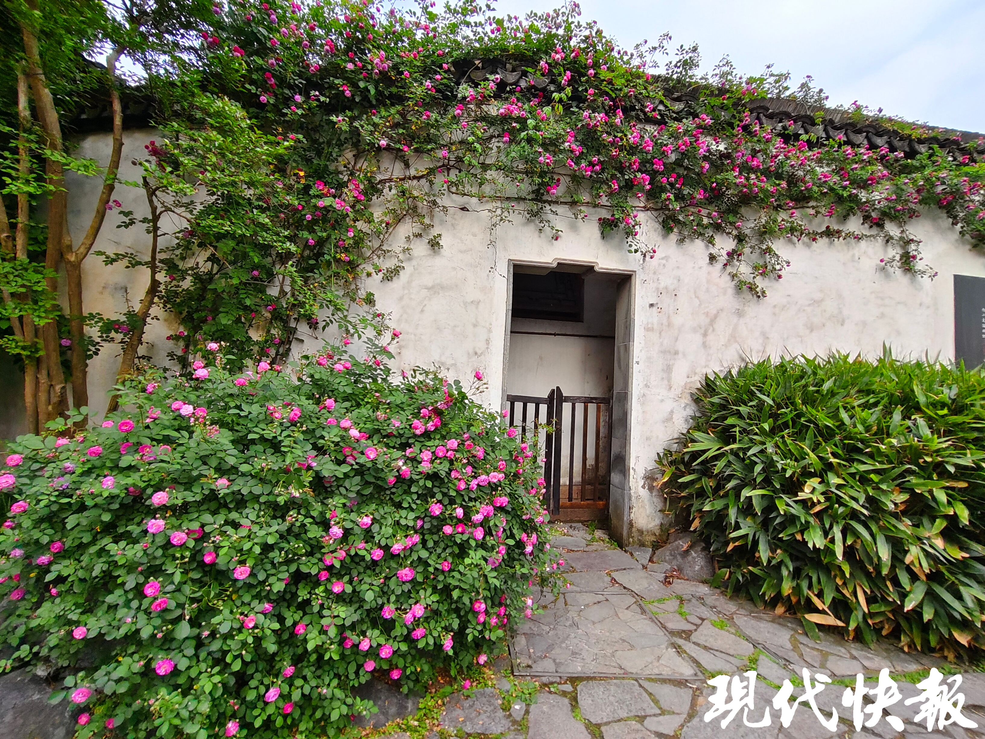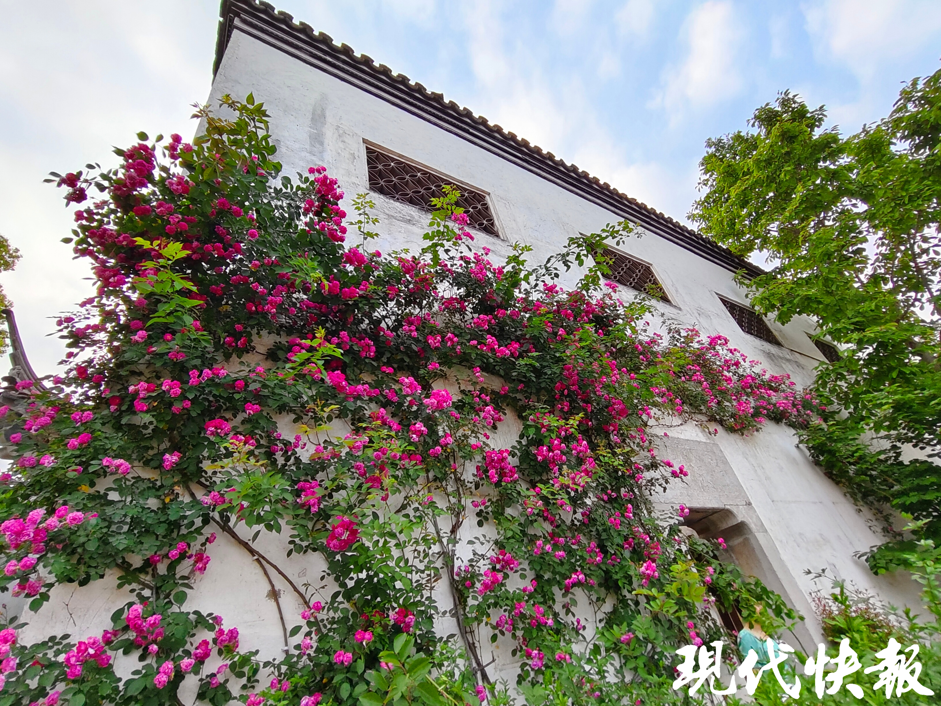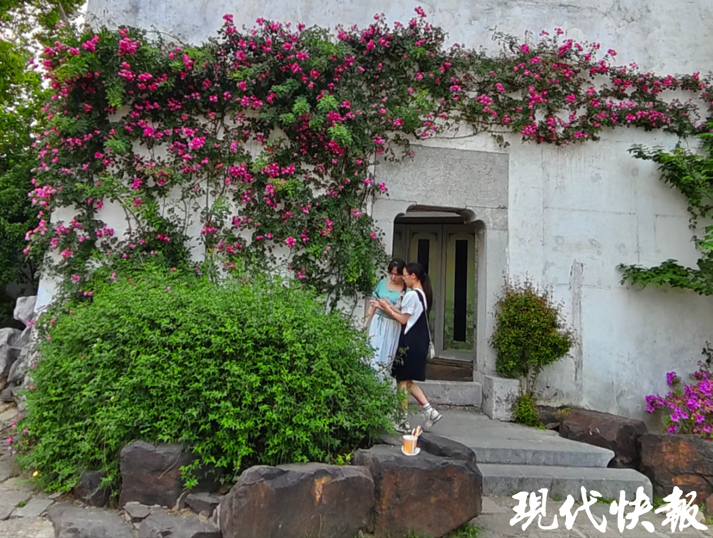 在惠山古镇景区,现代快报记者注意到,西神广场、倪云林祠、范文正公祠等多处蔷薇均迎来盛花期,花形精致,颜色明艳,蔷薇在微风中摇曳,香气沁人心脾。“我是跟着小红书来的,蔷薇花墙确实漂亮!”不少年轻游客成群结队,在花墙前合影、拍小视频,非常开心。