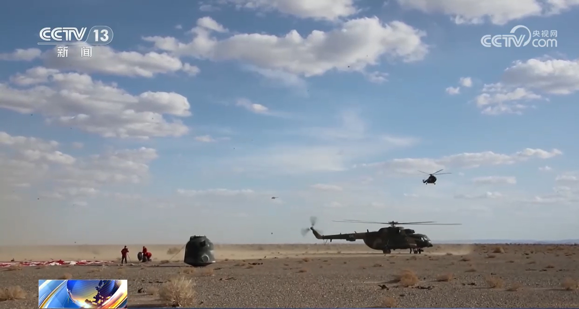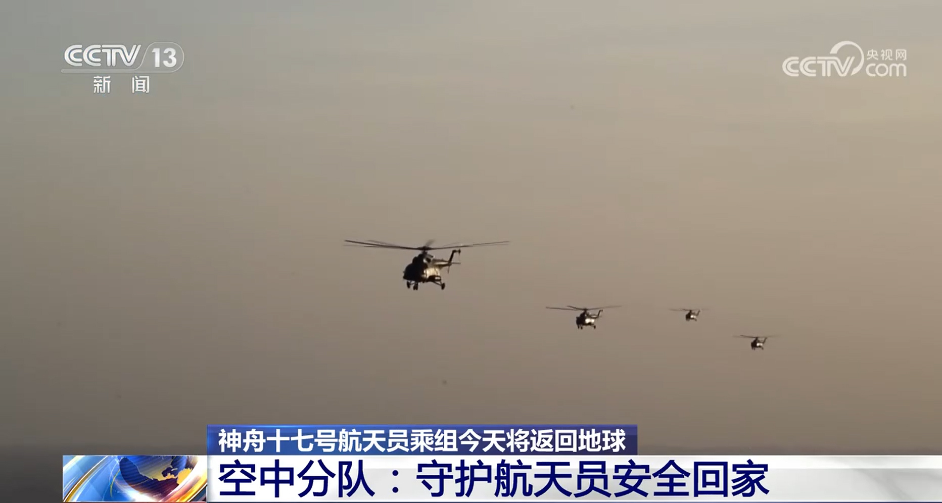 神舟十七号搜救回收任务空中分队王一凡:我们5架直升机空中布局的基本阵型为一个正方形,其中北面是2架,南面是3架,这样布局的目的是达到一个东西兼顾、南北并行,5架直升机分别采取高度差为200(米),这样构设的目的主要是为了后期集中收拢飞行时的一个安全考虑。
