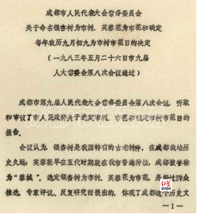 据成都档案馆官方微信“成都档案”介绍,1983年5月26日,《成都市人民代表大会常务委员会关于命名银杏树为市树、芙蓉花为市花和确定每年农历九月初九为市树市花日的决定》审议通过,正式命名银杏树为成都市“市树”、芙蓉花为成都市“市花”。每年的农历九月初九重阳节,为“市树市花日”。成都是国内最早确定“市树市花”的城市之一,也是目前世界上唯一一个有“市树市花日”的城市。