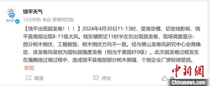 中新网潮州4月30日电(记者方伟彬陈楚红)记者30日从饶平县气象台(饶平县气象公共服务中心)获悉,当日饶平县出现弱龙卷风,此次弱龙卷过程发生在强飑线过境过程中,造成该县南部部分树木倒塌,个别企业厂房轻微受损。