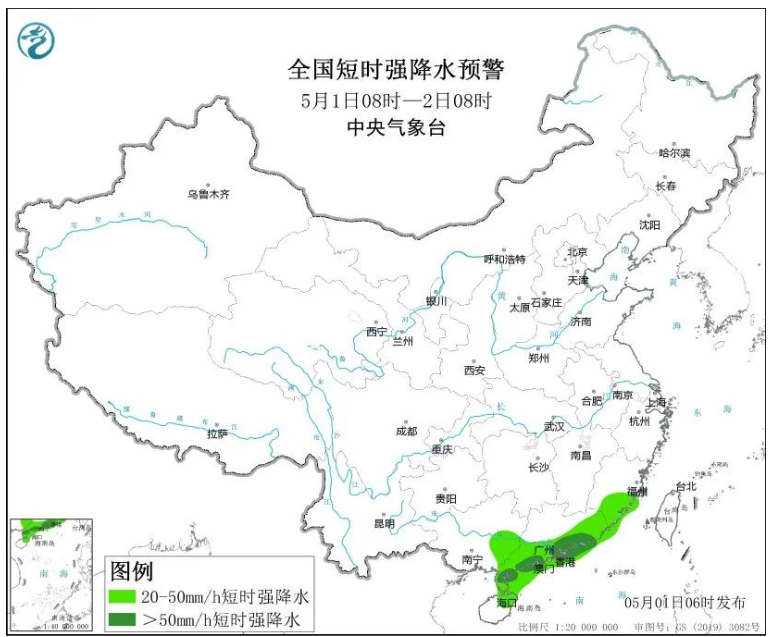 中央气象台5月1日06时继续发布暴雨蓝色预警:预计,5月1日08时至2日08时,广西东南部、广东中南部、福建南部、海南岛东部、台湾岛大部等地部分地区有大到暴雨,其中,广东南部沿海局地有大暴雨(100~150毫米)。上述部分地区伴有短时强降水(最大小时降雨量20~50毫米,局地可超过70毫米),局地有雷暴大风或冰雹等强对流天气。
