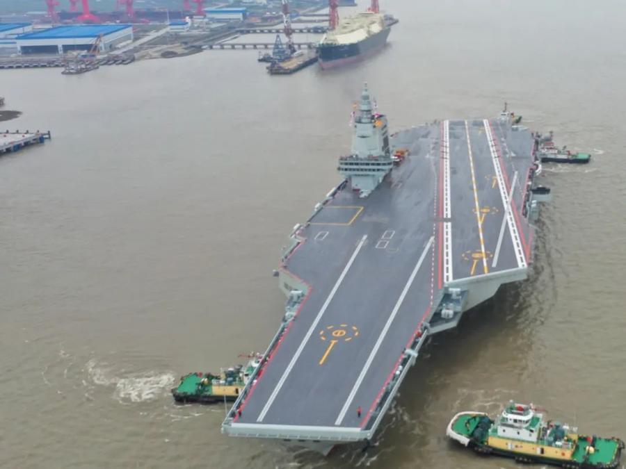 5月1日8时许,我国第三艘航空母舰福建舰从上海江南造船厂码头解缆启航,赴相关海域开展首次航行试验。这是拖船正在将福建舰拖离码头(无人机照片)。新华社发(蒲海洋摄)