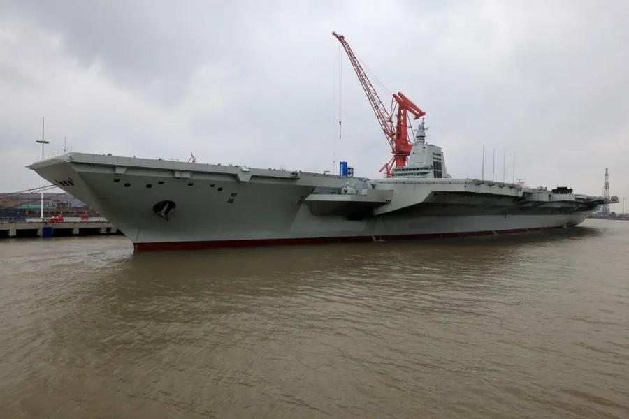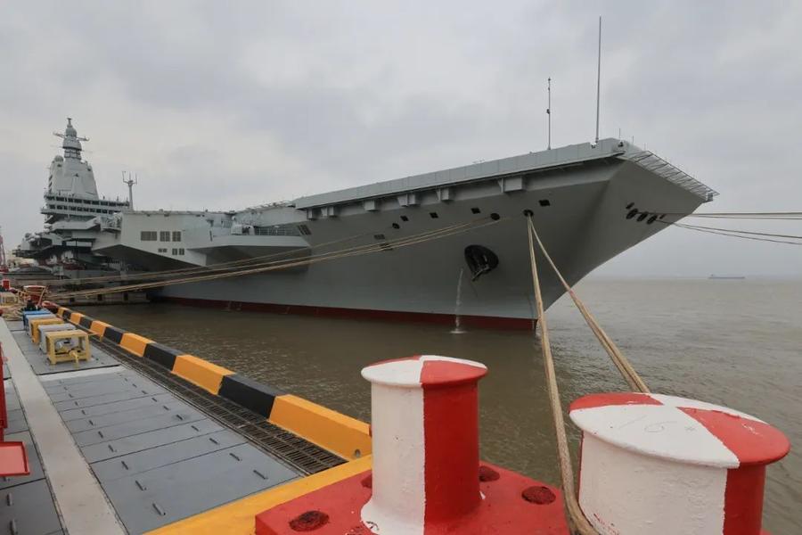 5月1日8时许,我国第三艘航空母舰福建舰从上海江南造船厂码头解缆启航,赴相关海域开展首次航行试验。这是首航前靠泊在码头的福建舰(4月30日摄)。新华社发(蒲海洋摄)