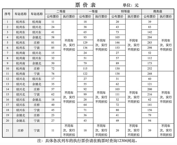 各站间执行票价将以公布票价为上限、5.5折为下限(如杭州东站至宁波站的二等座最低票价为47元,较现票价低约34%),实行多档次、灵活折扣的浮动票价体系,为旅客出行提供更多的选择。