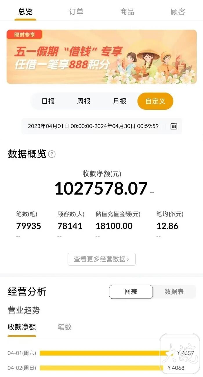 徐宇宁发给大皖新闻记者的营业数据截图显示:从2023年4月1日到2024年4月30日,收款净额为1027578.07元,“我的这个收款软件,最早只能显示到去年4月份。”此外现金平均每天还能收几百块钱,而当地公司、企业多,来自公司、企业的团单也挺多,“有的企业、公司团建、做活动,会买我们的饼,一次都是买一两百个,一次差不多就是千把块钱,都是转到我微信的,我们这种团单还是挺多的。”