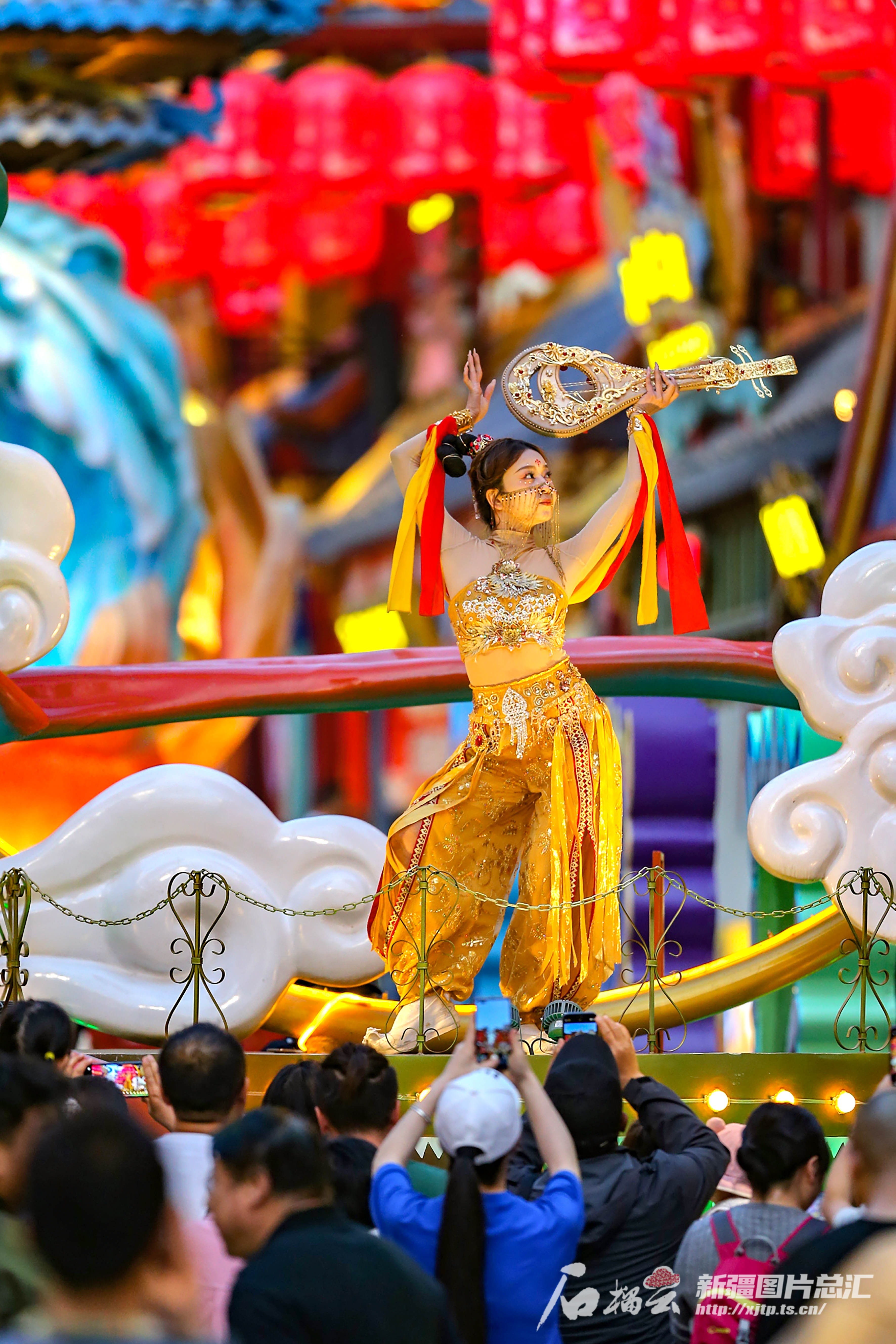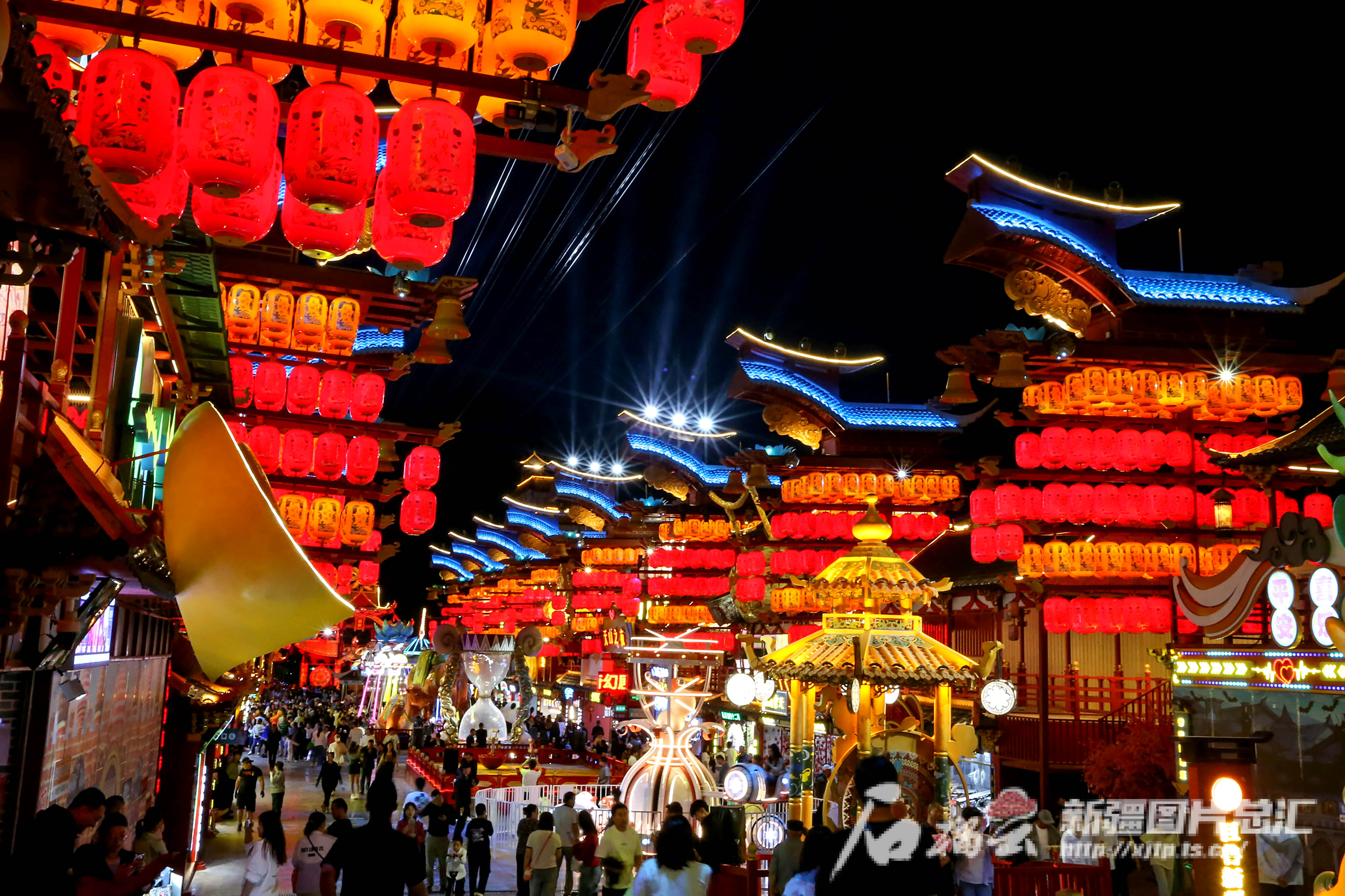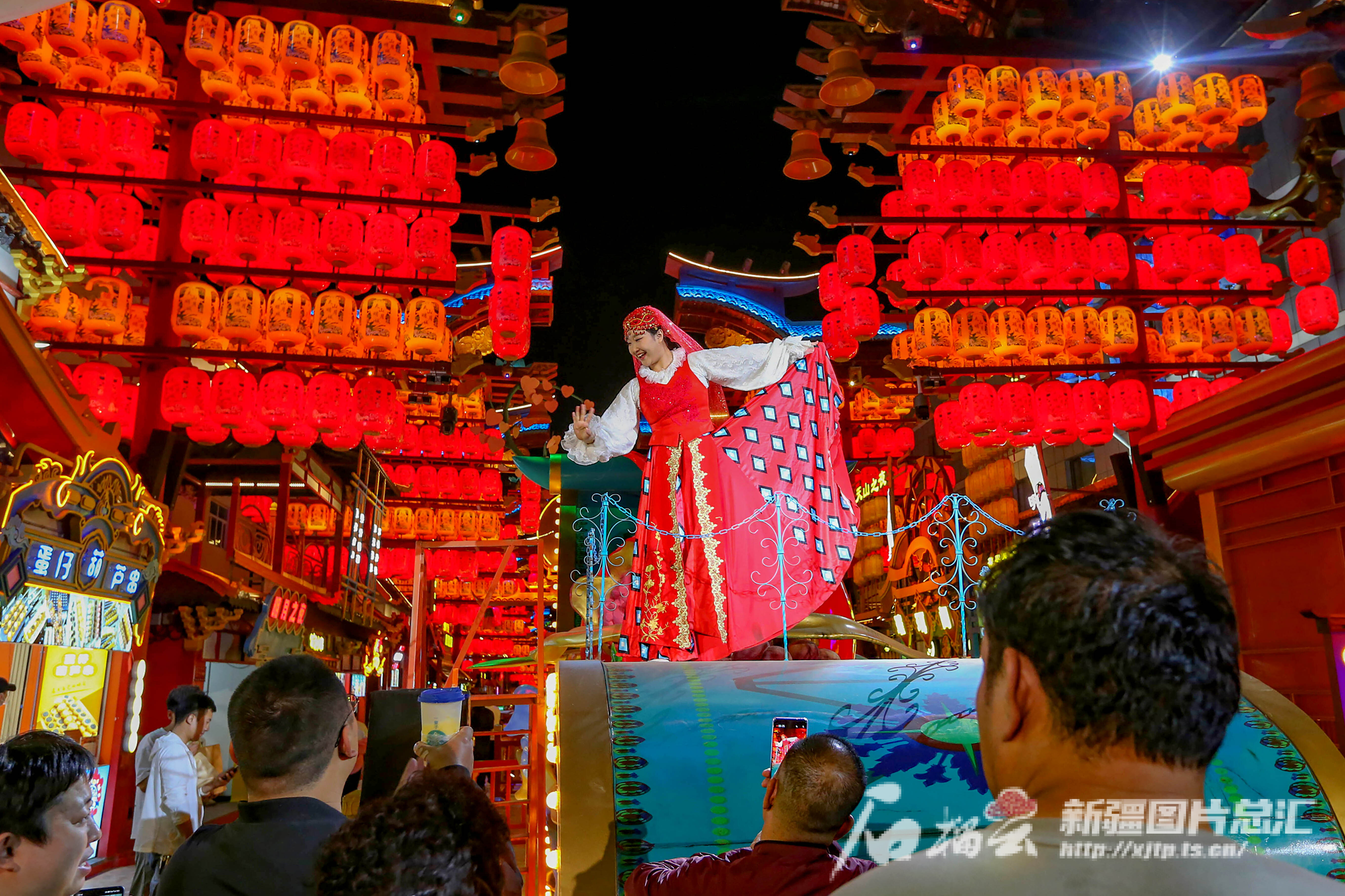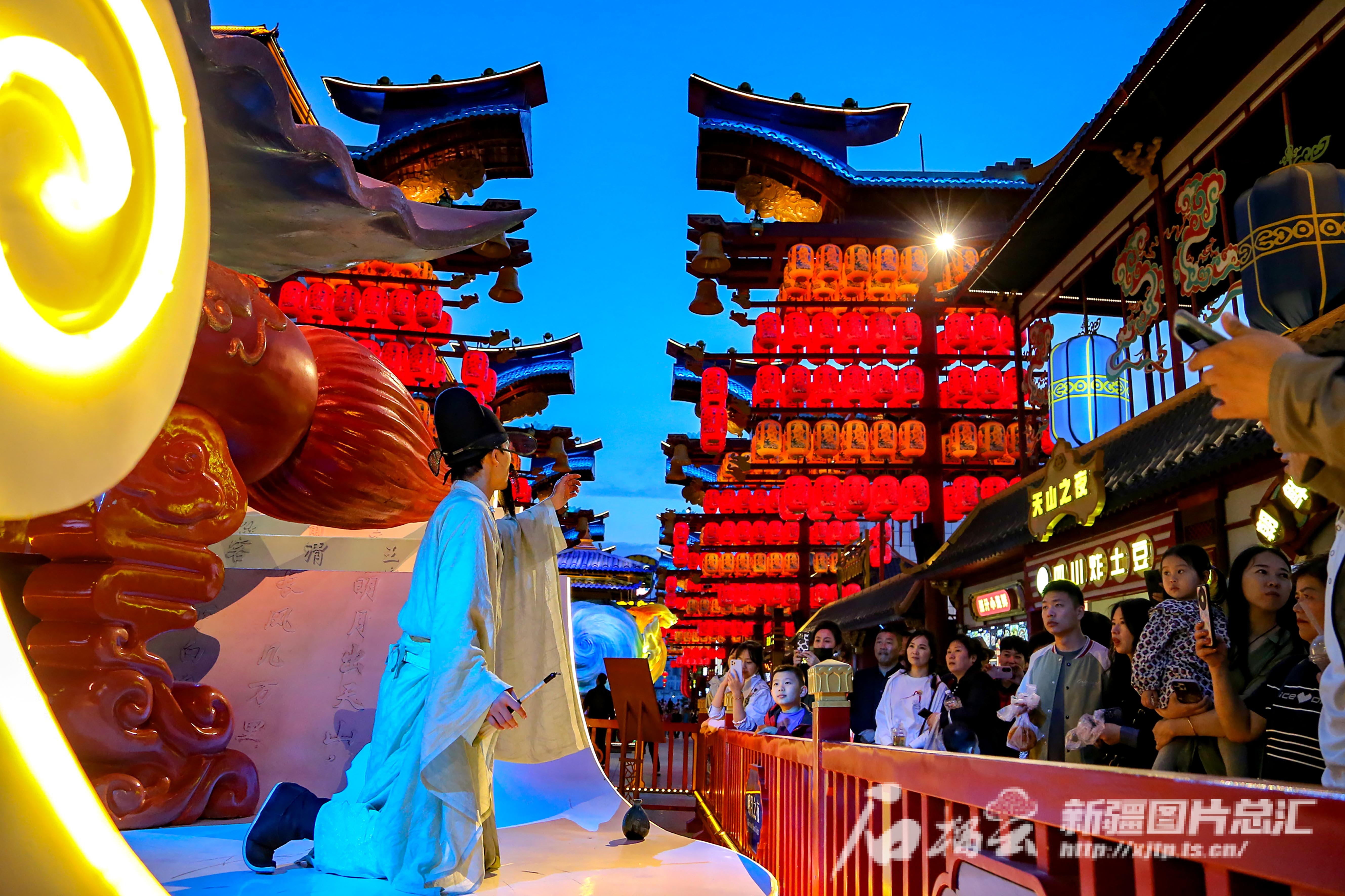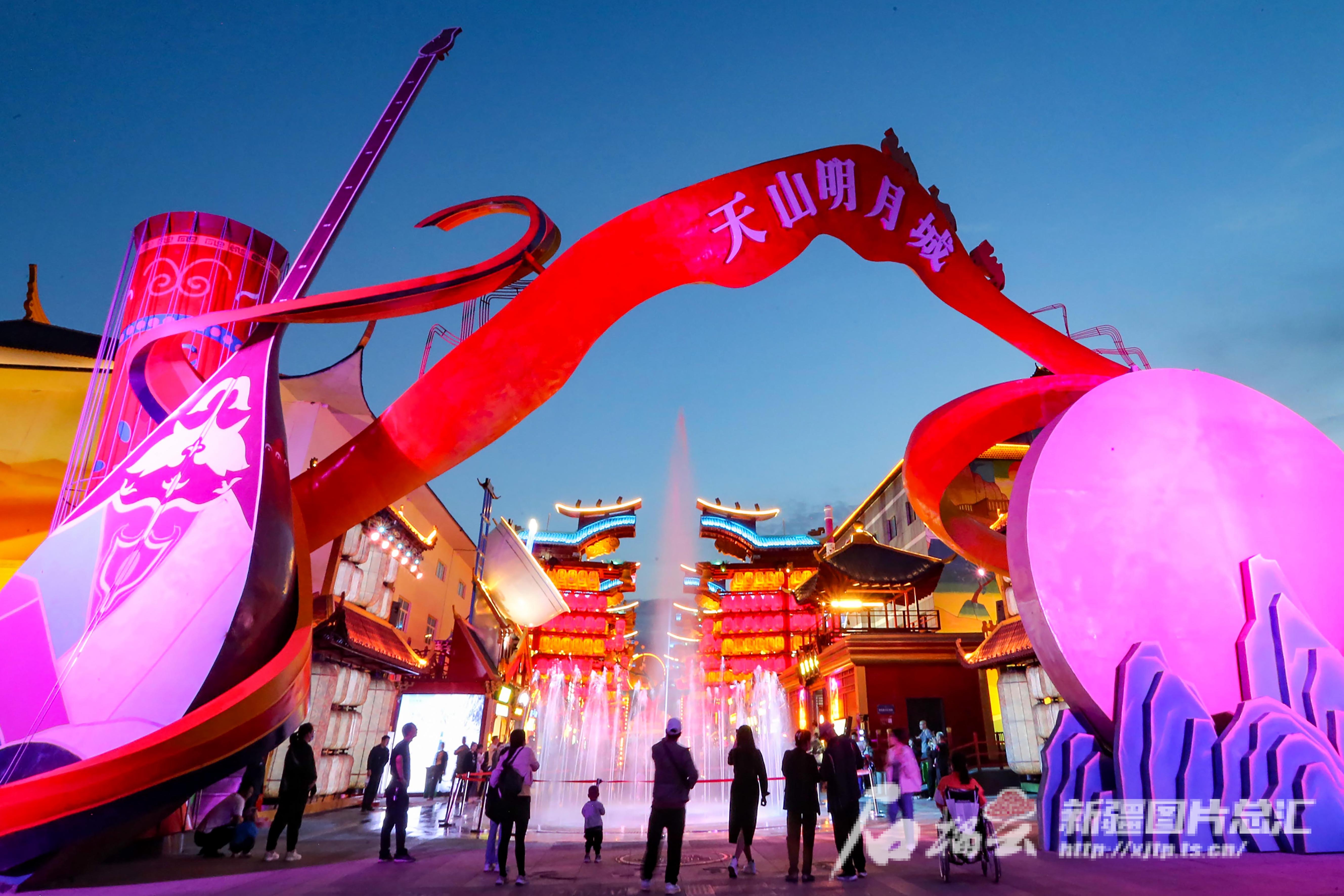 夜幕降临,天山明月城里灯火辉煌、美食飘香,游客纷至沓来,欣赏歌舞,品尝美食,感受天山脚下的烟火气。