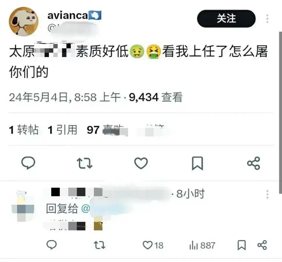 截图上的动态显示,该账号以“砸死中国人”“下辈子投胎至某国”“在某国我有血亲”等言语辱骂国人、辱华。该留学生还质问“太原这座北方小城是给人住的吗”,并称家里被相关部门盯上一毛钱也送不出来,自己在国外“断粮”,升学、工作没着落。时间为2024年5月1日的截图显示,该留学生称自己在一系列的帮助下进入国税体制内,五一假期后上班“吃皇粮”,“你们都要给我好好缴税。”