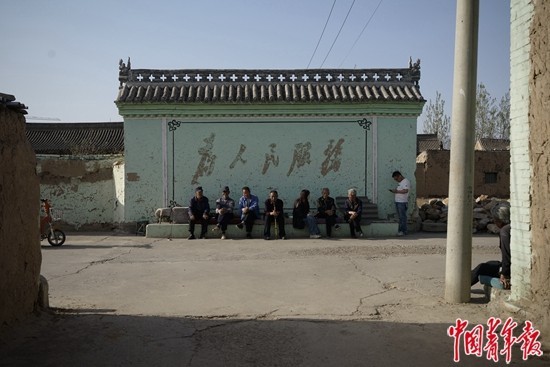 4月17日,山西代县,一位年轻记者在坐满老人的照壁下采访。