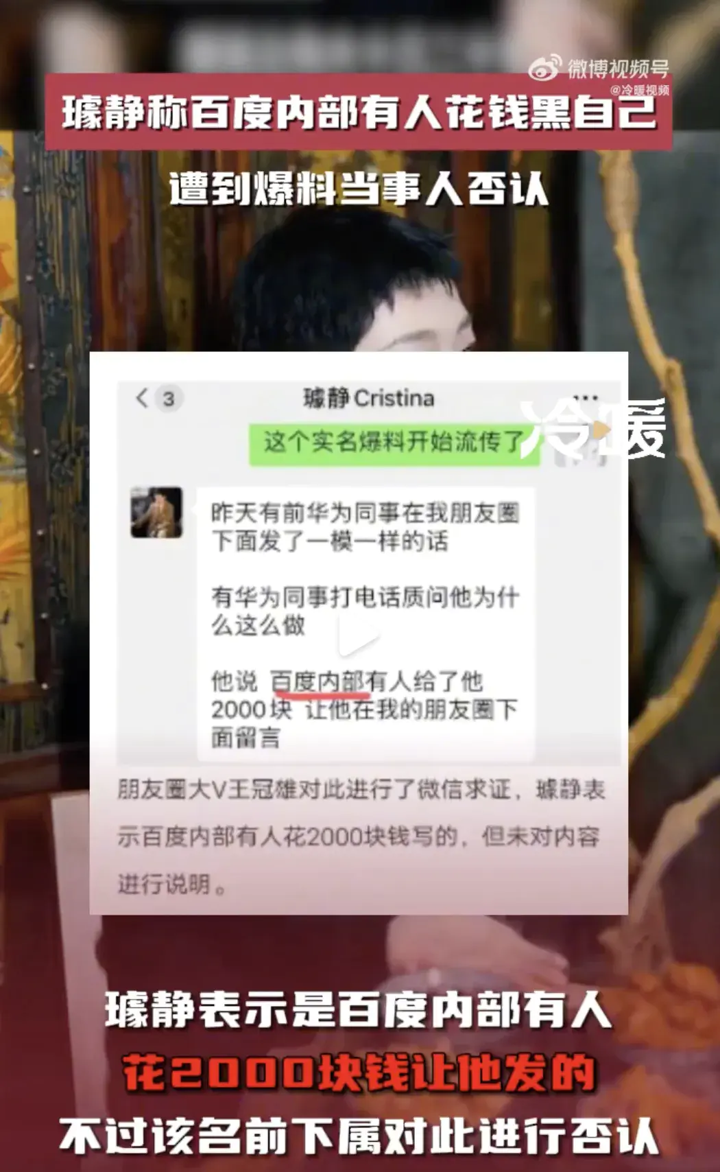 据冷暖视频,9日凌晨,璩静发朋友圈就短视频事件致歉后,有璩静前华为下属员工实名披露更多内幕。璩静表示是百度内部有人花2000块钱让他发的,不过该名前下属对此否认。