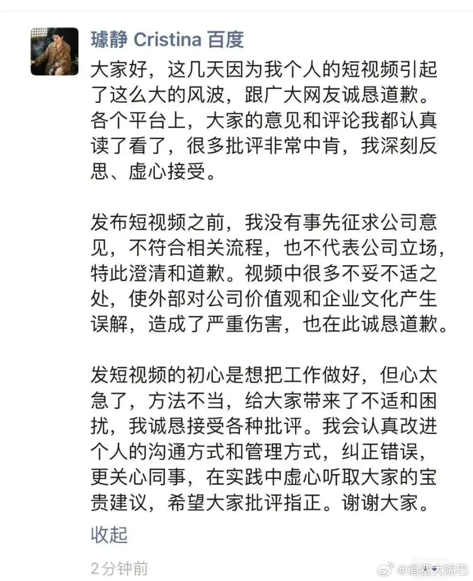 此前,璩静在抖音上发布数条短视频,比如“员工闹分手提离职我秒批,为什么要考虑员工的家庭。我又不是她婆婆,我主要考虑的是他能不能在他的岗位,及时给我交付结果”“干公关你就别想休周末”等言论引发热议。