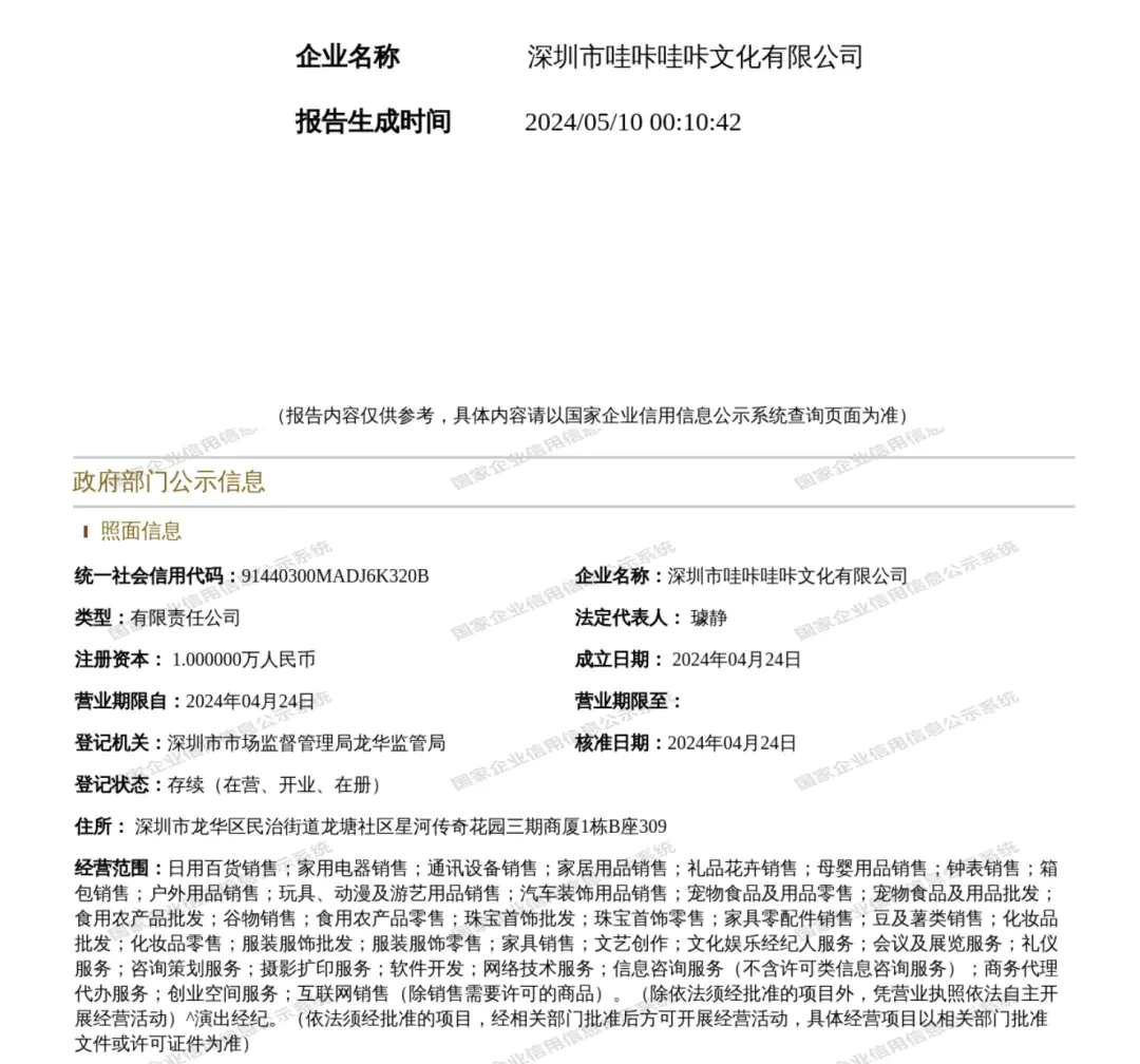 值得注意的是,据第一财经报道,天眼查信息显示,今年4月24日深圳市哇咔哇咔文化有限公司成立,该公司法人为璩静。
