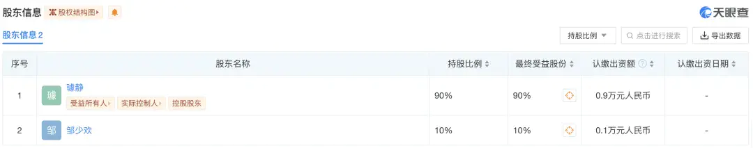 公司经营范围包括日用品销售、家电销售、通讯设备销售、服装服饰零售、文化娱乐经纪人服务等。相关人士告诉第一财经记者,该公司法人即为刚刚离职的百度副总裁璩静,持股比例90%。另一名持股10%的股东邹少欢是璩静在百度任职期间的助理。