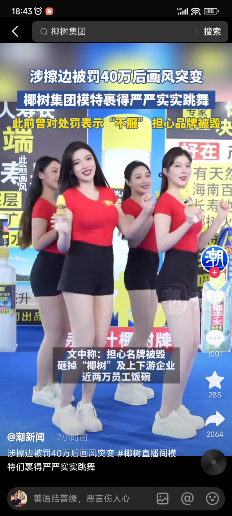 该视频12日在社交平台上热传,“一身反骨,椰树涉擦边广告被罚40万后,主播直播裹得严严实实”“椰树直播间风格大变”等迅速成为互联网的热门话题,引发广泛关注和争议。