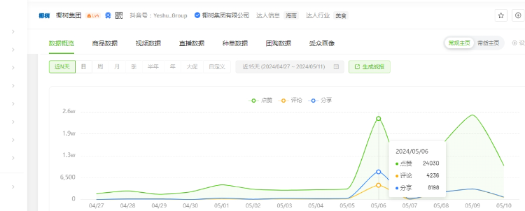 在点赞量、评论量和转发量(分享量)方面,椰树集团官方抖音账号却有惊艳表现。以这波话题未开始的4月29日为例,其点赞为1539,评论115,分享175;5月6日,这三项数据提升为24030、4238、8198;5月9日,这三项数据为25092、3098、3138。在点赞上有10多倍增长,在评论、分享上有数十倍增长。可见,这波话题对于椰树的品牌曝光度,提升极其明显。