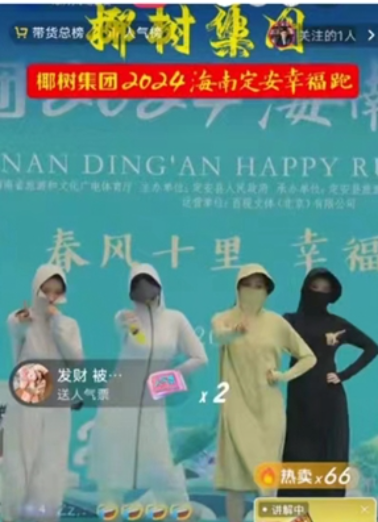 11日下午,网络上出现“椰树直播间风格大变”相关视频——疑似椰树集团的4名女主播一改往日“清凉”穿衣风格,身着长长的防晒服,将脸部和全身都裹得严严实实的,在“椰树集团2024海南安定幸福跑”活动背景墙前跳舞。