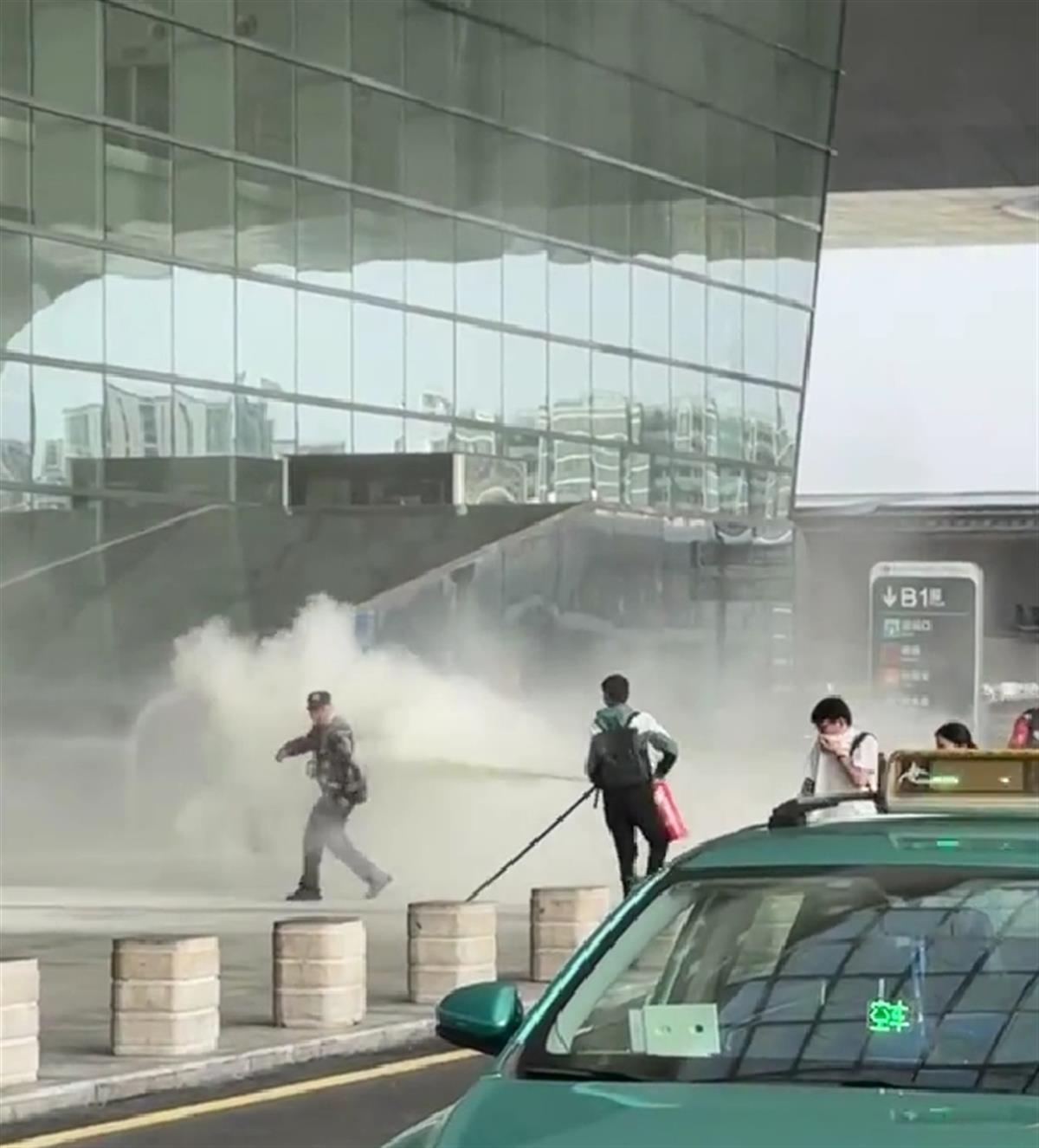 现场视频显示,一名男子手持灭火器先后喷射多名保安。有保安上前试图阻止他,但被其用灭火器喷射后退。最后,有保安用防爆叉将其控制,几人快速上前将男子按倒在地。视频还显示,现场有“杭州东站”字样。