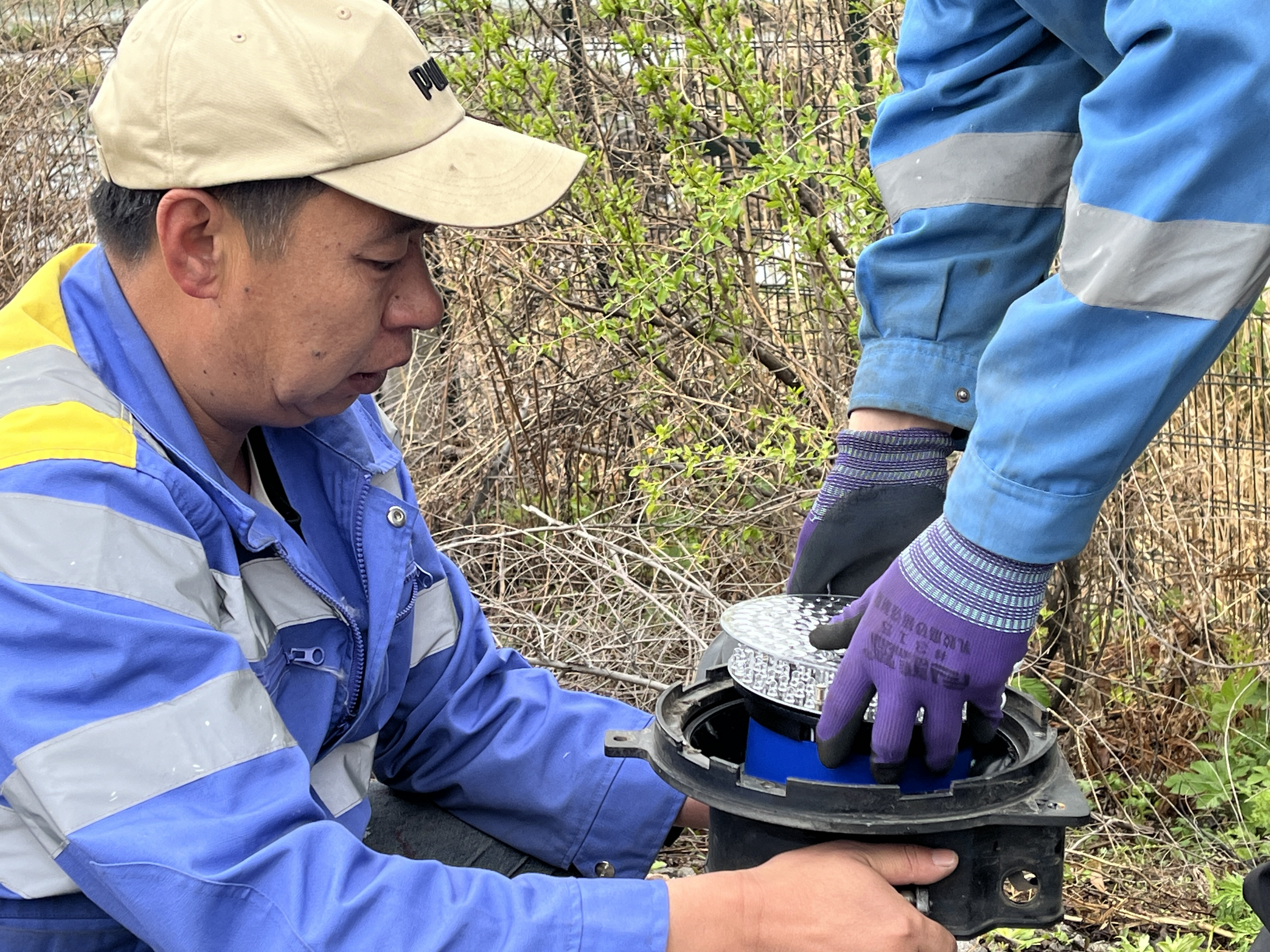 地面作业人员正在安装LED发光盘(张国华 摄)