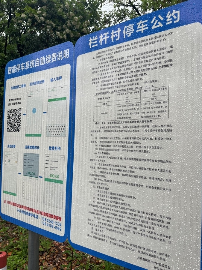 顺着村民的指引,记者前往距离界龙村不远的栏杆村查看收费细则,这里小型车月租费为100元,临时停车1小时内免费,超过1小时按5元/小时收费,24小时30元封顶;大型车月租250元,临时停车1小时内免费,超过1小时按8元/小时收费,24小时100元封顶。