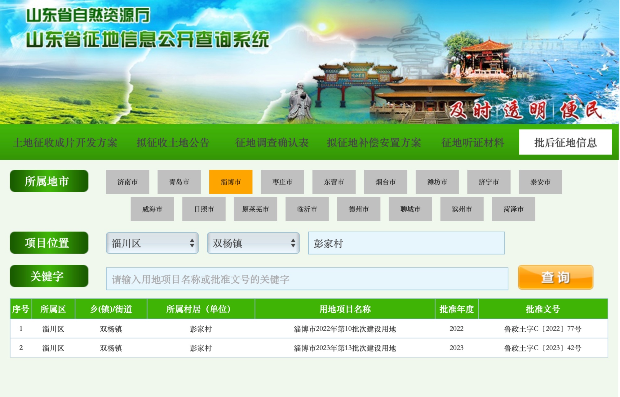 山东省征地信息公开查询系统公示的彭家村征地信息(图片来自山东省自然资源厅)