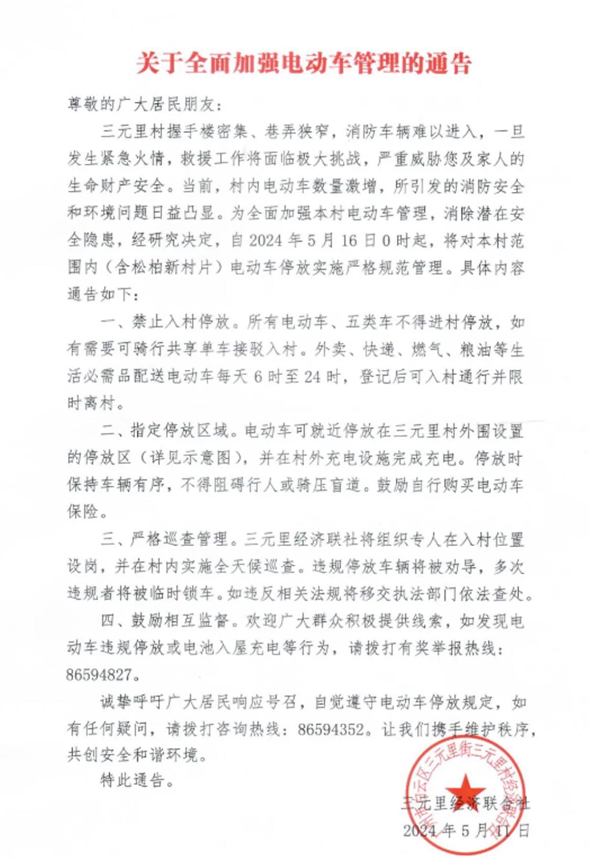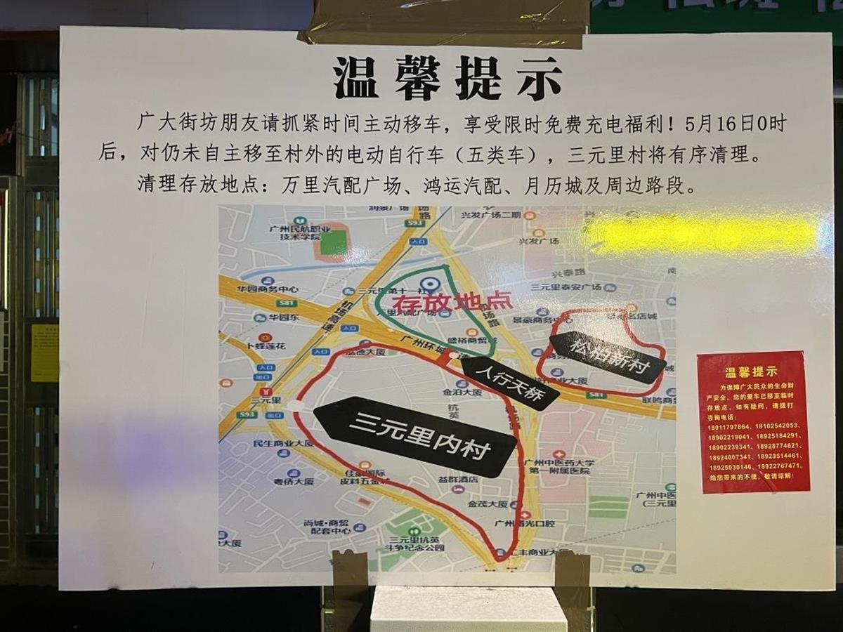 5月14日,“三元里西约居委会”微信公众号发布了关于加强电动车管理的通告。通告称,三元里村“握手楼”密集、巷弄狭窄,消防车辆难以进入,一旦发生紧急火情,救援工作将面临极大挑战。当前,村内电动车数量激增,所引发的消防安全和环境问题日益凸显。为全面加强本村电动车管理,消除潜在安全隐患,经研究决定,自5月16日0时起,将对本村范围内(含松柏新村片)电动车停放实施严格规范管理。三元里村所有电动车、五类车不得进村停放,如有需要可骑行共享单车接驳入村。外卖、快递、燃气、粮油等生活必需品配送电动车每天6时至24时,登记后可入村通行并限时离村。