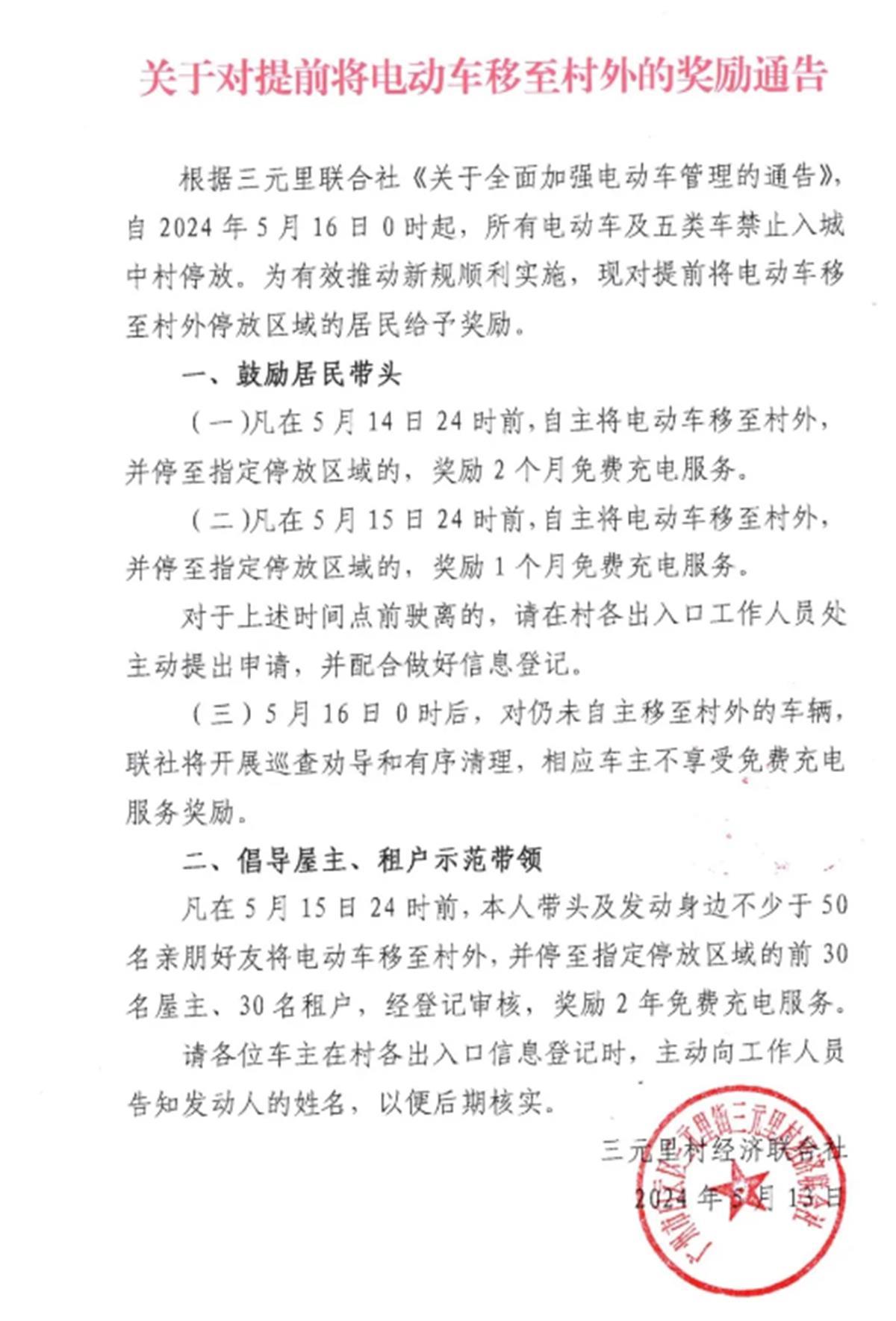 另一份盖有广州市白云区三元里街三元里村经济联合社印章的《关于对提前将电动车移至村外的奖励通告》中提到,自主将电动车移至村外指定停放区域,将给予1至2个月免费充电服务的奖励。