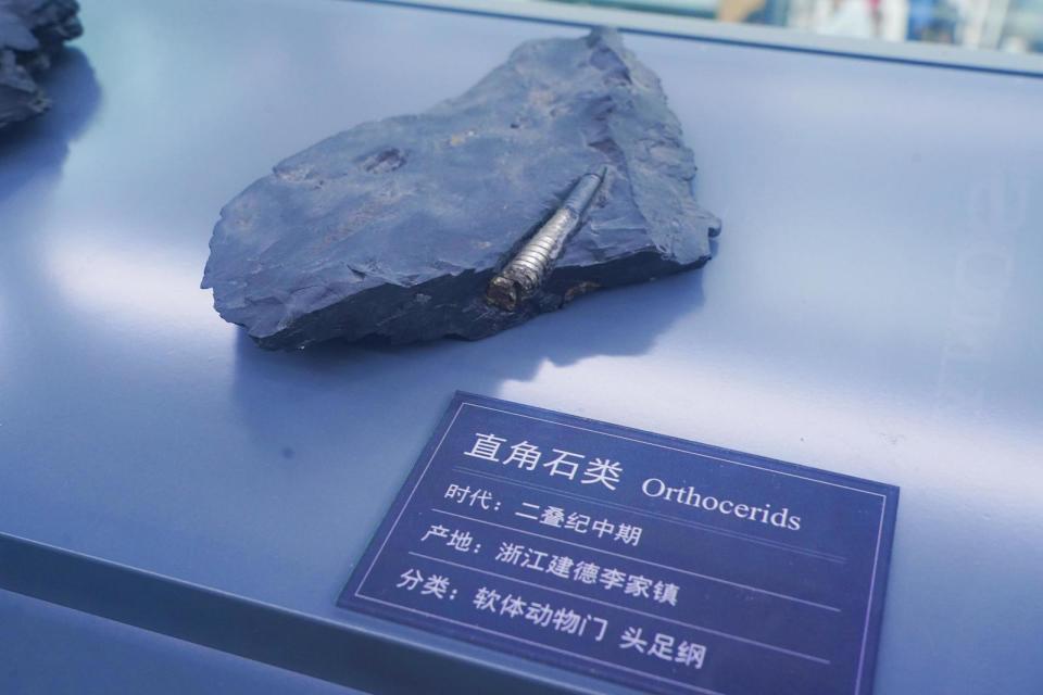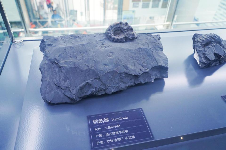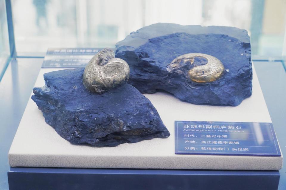 展柜里,寿昌道比赫菊石、亚球形副桐庐菊石、鹦鹉螺等化石都闪着耀眼金光。