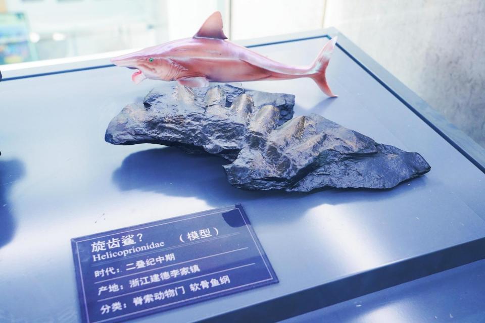 此外,展柜里还展示了在建德李家镇发现的旋齿鲨的牙齿化石,这些牙齿内卷成环状,呈螺旋形排列,非常奇妙。自发现之日起,旋齿鲨牙齿的生长位置、方式和功能一直备受争议。