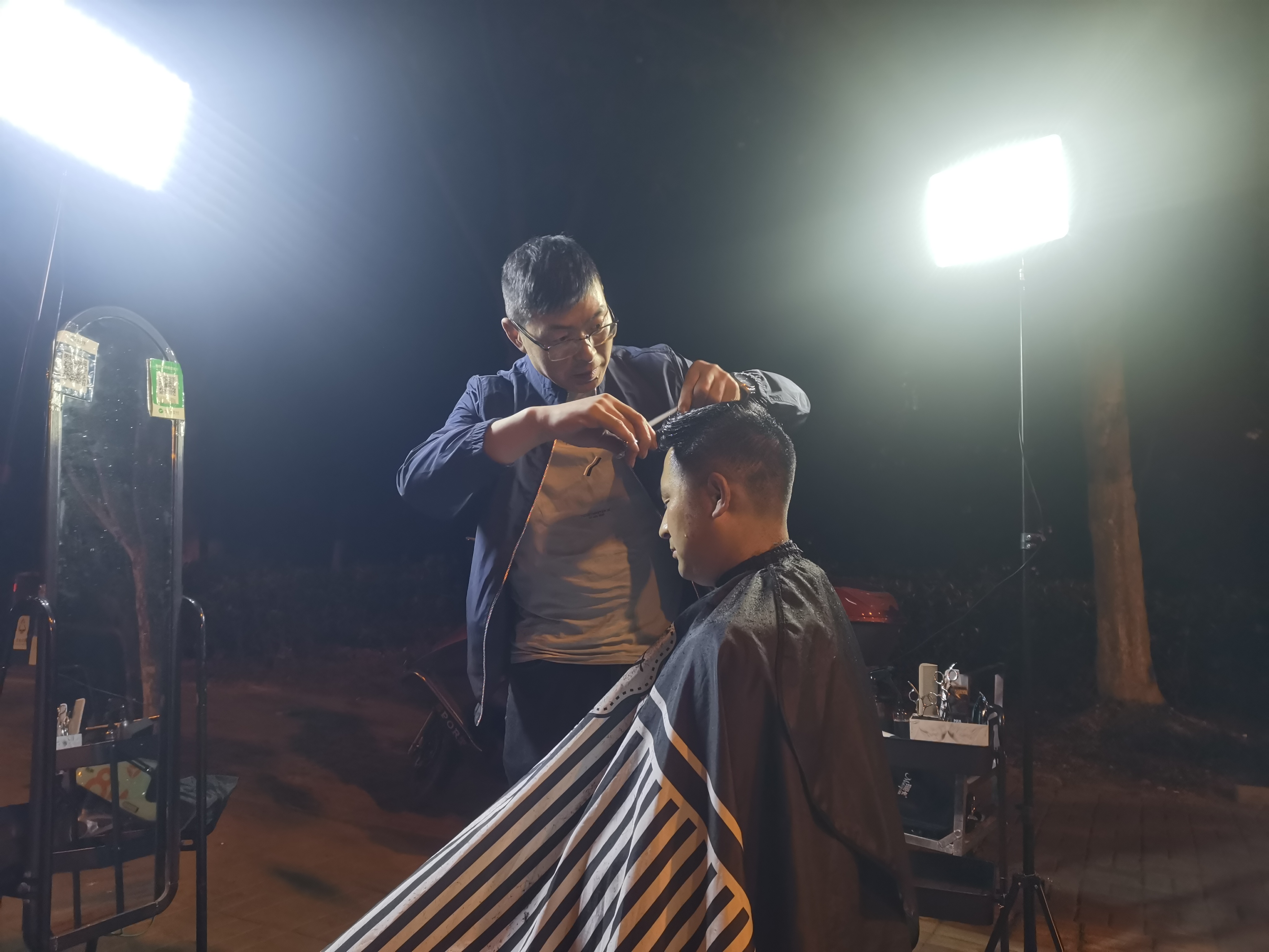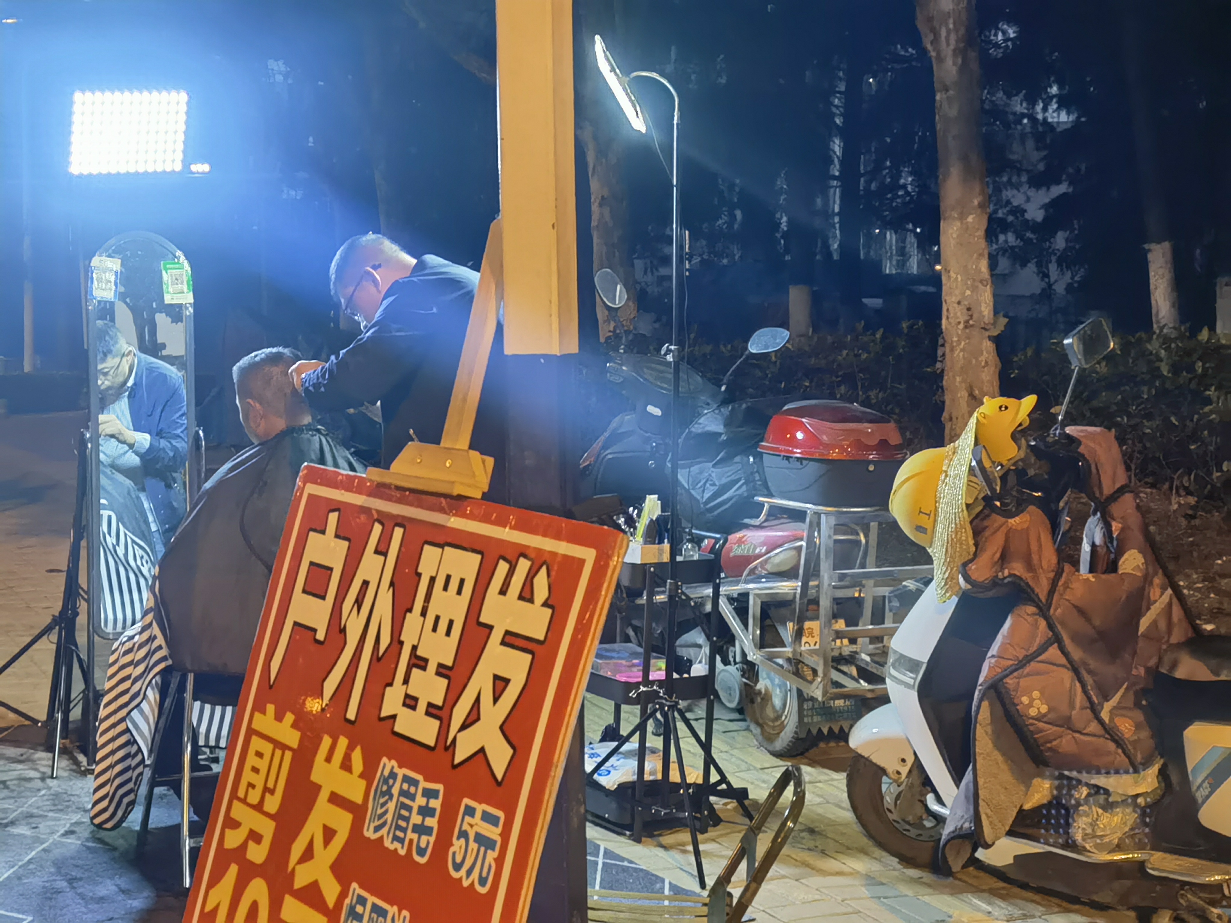 每天准时下班后,凌师傅大概晚上7点半到达街边,花10多分钟搭建了理发的设备,就开始营业了。“我来得比较迟,一般在晚上12点钟收摊,但是12点后有人还来找我帮忙理个发,我也会答应。”凌师傅在分享他的摆摊经历时满脸笑意地说,“我一点都不累,下班后能找点自己喜欢的事做,还能被顾客夸,我感觉到已经非常满意了。”