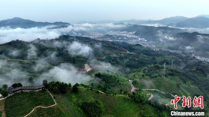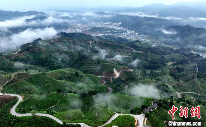 5月22日,无人机航拍的广西三江侗族自治县易地搬迁万亩茶园振兴产业园景色,缥缈晨雾与特色民宿、青翠茶园相互映衬,美如仙境。