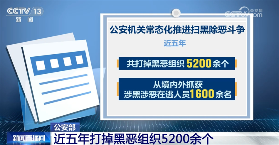 公安机关常态化推进扫黑除恶斗争,近五年共打掉黑恶组织5200余个,从境内外抓获涉黑涉恶在逃人员1600余名。全国现行命案破案率为99.94%,达到历史最高水平。