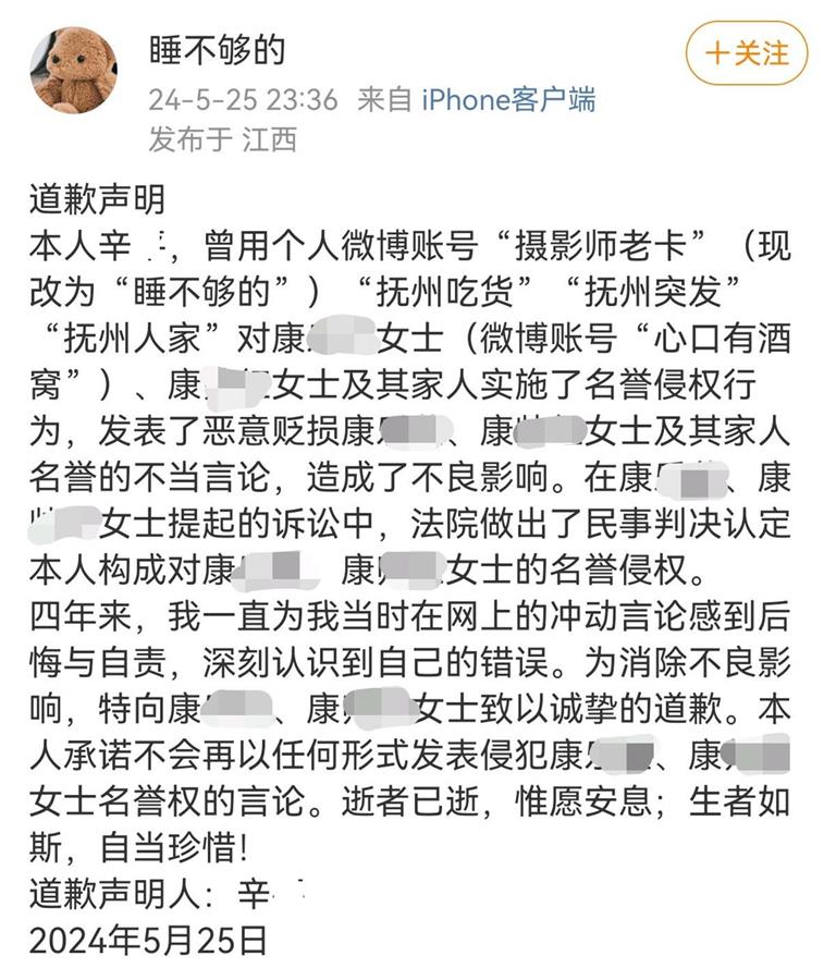 康女士告诉极目新闻记者,目前法院判决已经生效,辛某已支付了相应的赔偿。极目新闻记者注意到,5月25日,辛某的相关微博账号已发布了道歉声明:“四年来,我一直为我当时在网上的冲动言论感到后悔与自责,深刻认识到自己的错误。为消除不良影响,特向康女士姐妹俩致以诚挚的道歉。”