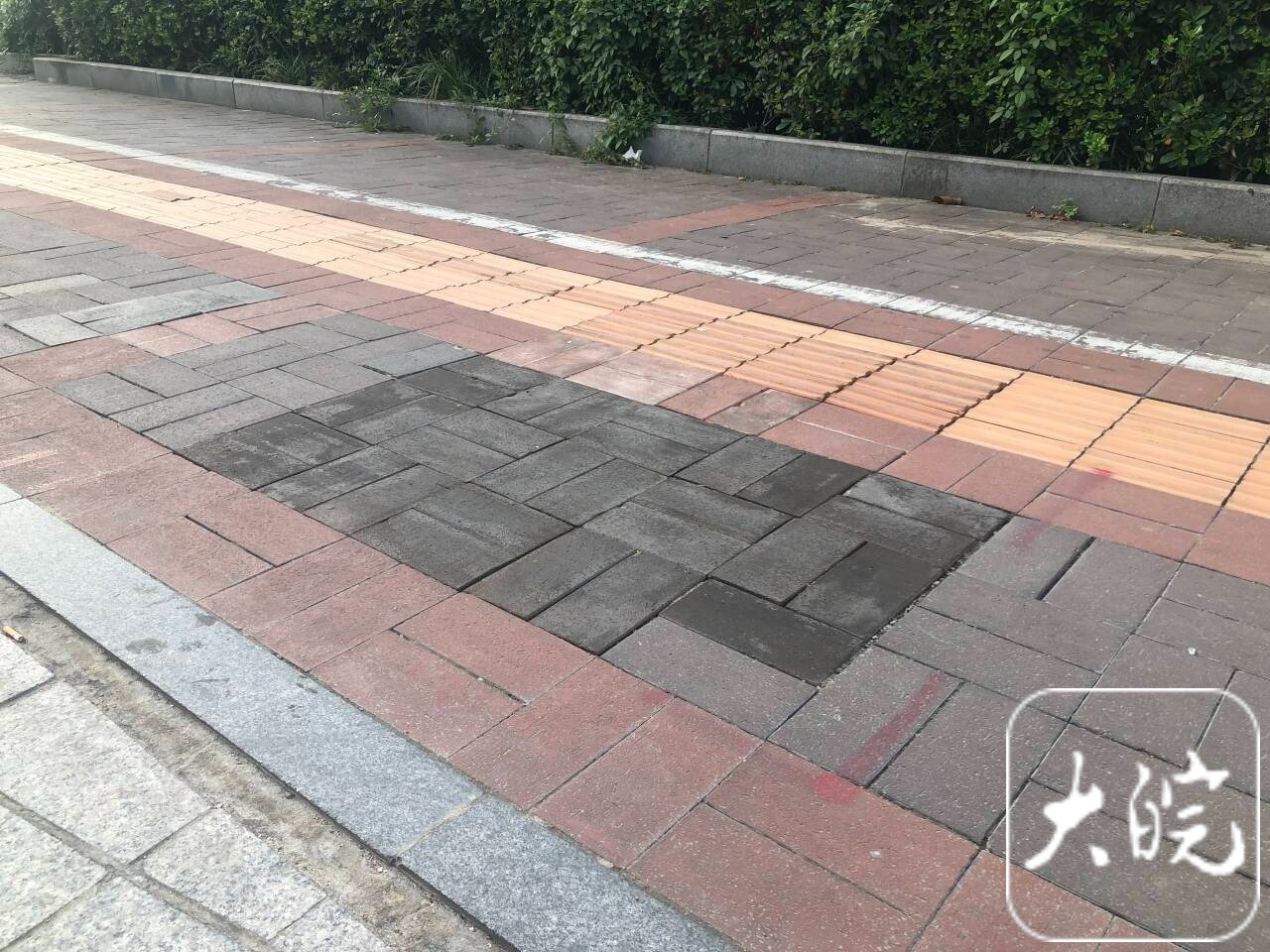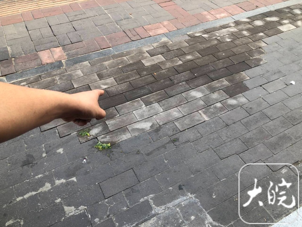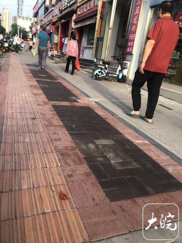 6月1日下午,大皖新闻记者来到合肥市淠河路与潜山路交口东侧,在道路南侧人行道入口附近,一处盲道和一片地砖有明显修复痕迹,现场已看不到碎裂的砖块。