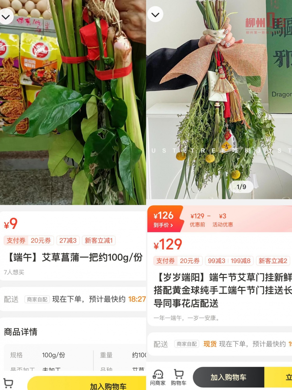 在某外卖平台上,记者注意到,一把艾草的价格在9元左右,而经过花艺师包装后的艾草门挂价格在50元左右,再加上香囊、编绳等装饰物的艾草门挂价格最高,售价为129元。