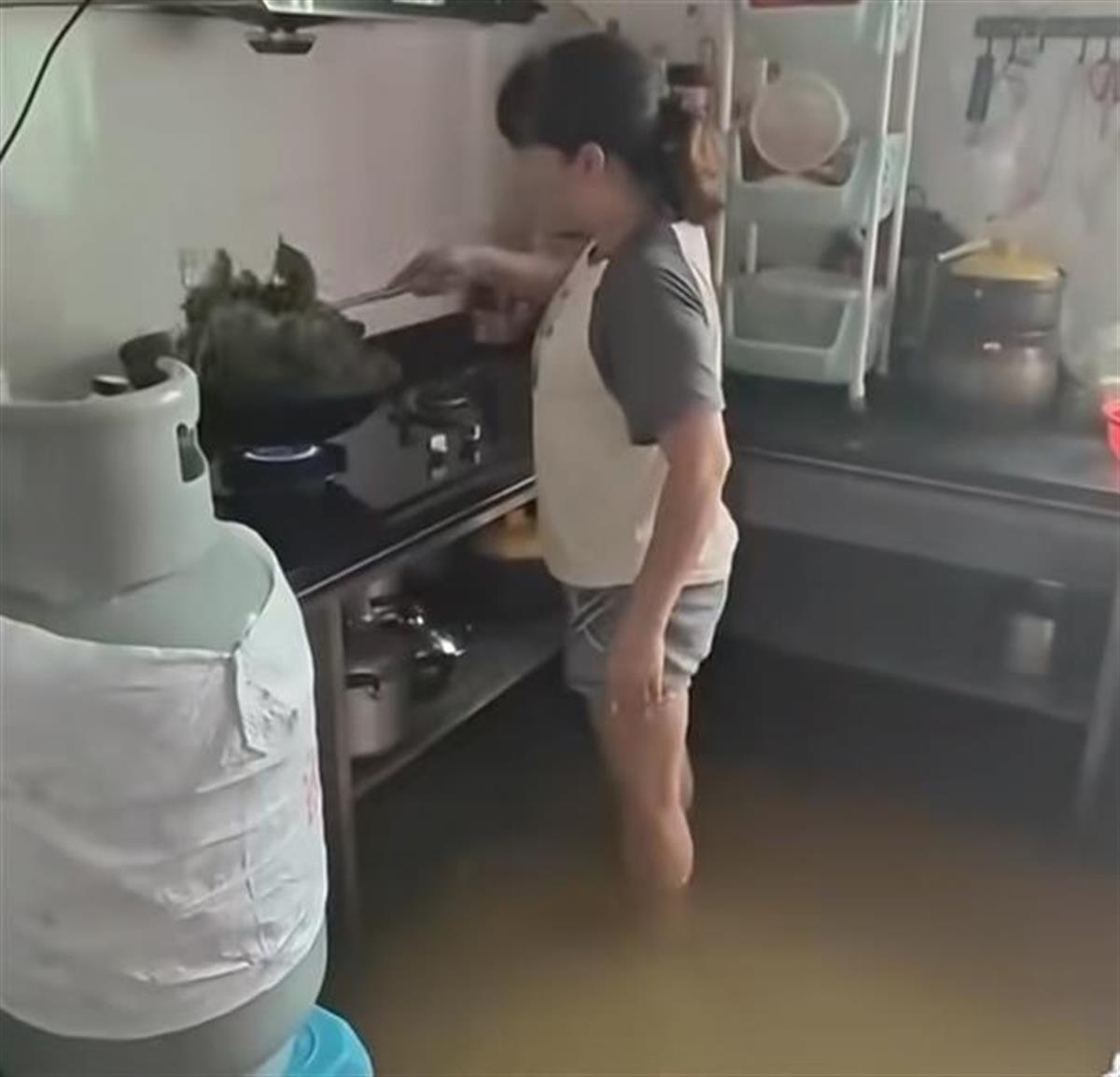 博铺街道居民在家中积水中做饭(广东台今日关注报道截图)