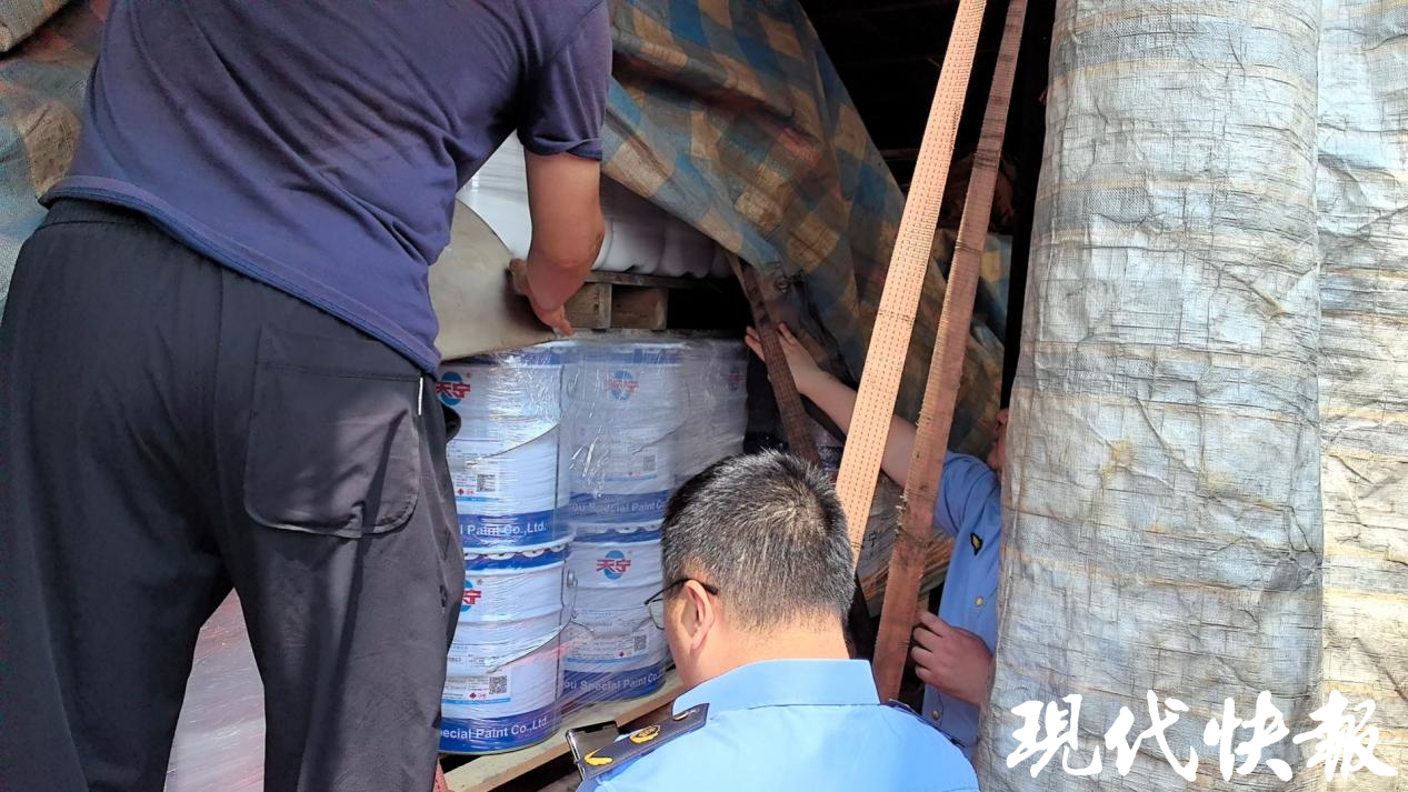 问话中,驾驶员申某一度想掩盖自己的违章行为,一直强调自己文化水平低,看不懂危险品,装货卸货都是其他人做的,自己只负责开车。在执法人员的耐心普法下,最终,申某承认是自己为了逃避检查,将11吨工业漆(3类易燃液体)放在货车下层,上层及尾部堆放了其他货物进行遮挡,车厢外层还包裹了雨布。