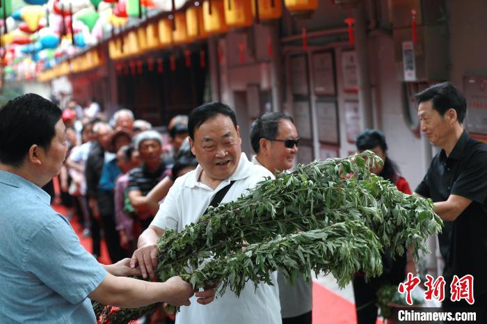 6月7日,在湖北省宜昌市秭归县非遗小巷,人们开始做粽子、绣香包、割艾蒿、编花环、蒸粑粑等,迎接端午节的到来。秭归是屈原故里,当地至今仍沿袭“秭归端午比年大,一个端午三次过”的独特习俗。图为湖北省秭归县居民在非遗小巷领取艾叶。王罡摄