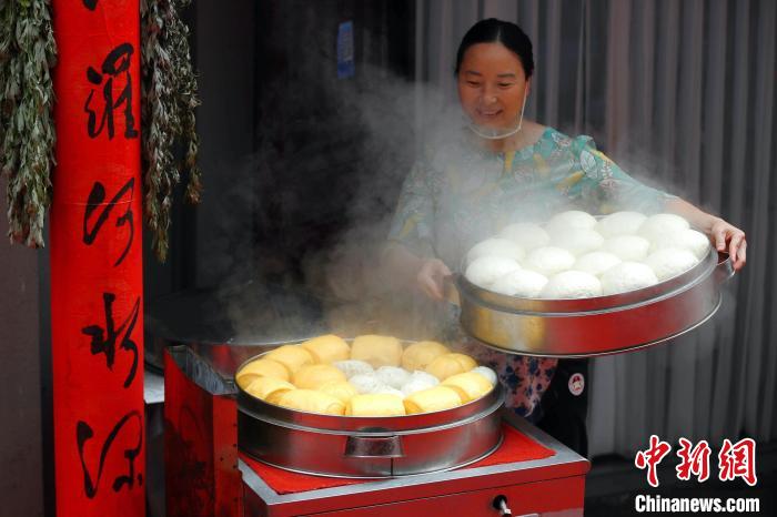 6月7日,在湖北省宜昌市秭归县非遗小巷,人们开始做粽子、绣香包、割艾蒿、编花环、蒸粑粑等,迎接端午节的到来。秭归是屈原故里,当地至今仍沿袭“秭归端午比年大,一个端午三次过”的独特习俗。图为湖北省秭归县居民端出刚刚蒸好的麦面粑粑。王罡摄