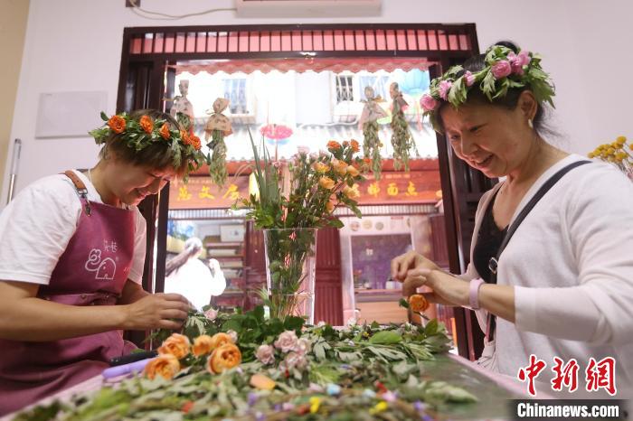 6月7日,在湖北省宜昌市秭归县非遗小巷,人们开始做粽子、绣香包、割艾蒿、编花环、蒸粑粑等,迎接端午节的到来。秭归是屈原故里,当地至今仍沿袭“秭归端午比年大,一个端午三次过”的独特习俗。图为在湖北省秭归县,民间艺人制作艾叶花环。王罡摄