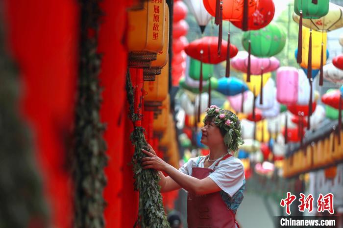 6月7日,在湖北省宜昌市秭归县非遗小巷,人们开始做粽子、绣香包、割艾蒿、编花环、蒸粑粑等,迎接端午节的到来。秭归是屈原故里,当地至今仍沿袭“秭归端午比年大,一个端午三次过”的独特习俗。图为在湖北省秭归县非遗小巷,店铺主在门前悬挂菖蒲艾叶。王罡摄