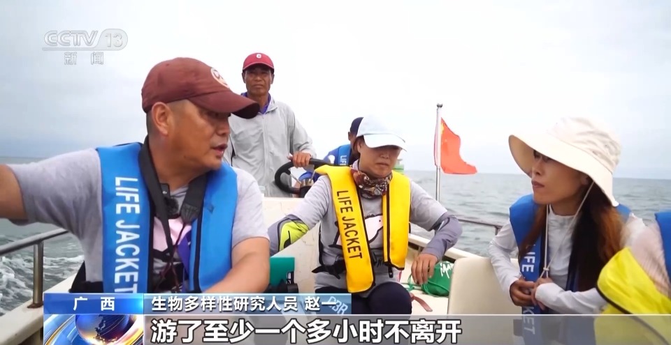生物多样性研究人员 赵一:我们出海的话,小海豚有的时候会到我们的船边玩一下,不会老围着这个船玩。但那天“小墩墩”就在我们的周围,游了至少一个多小时不离开。