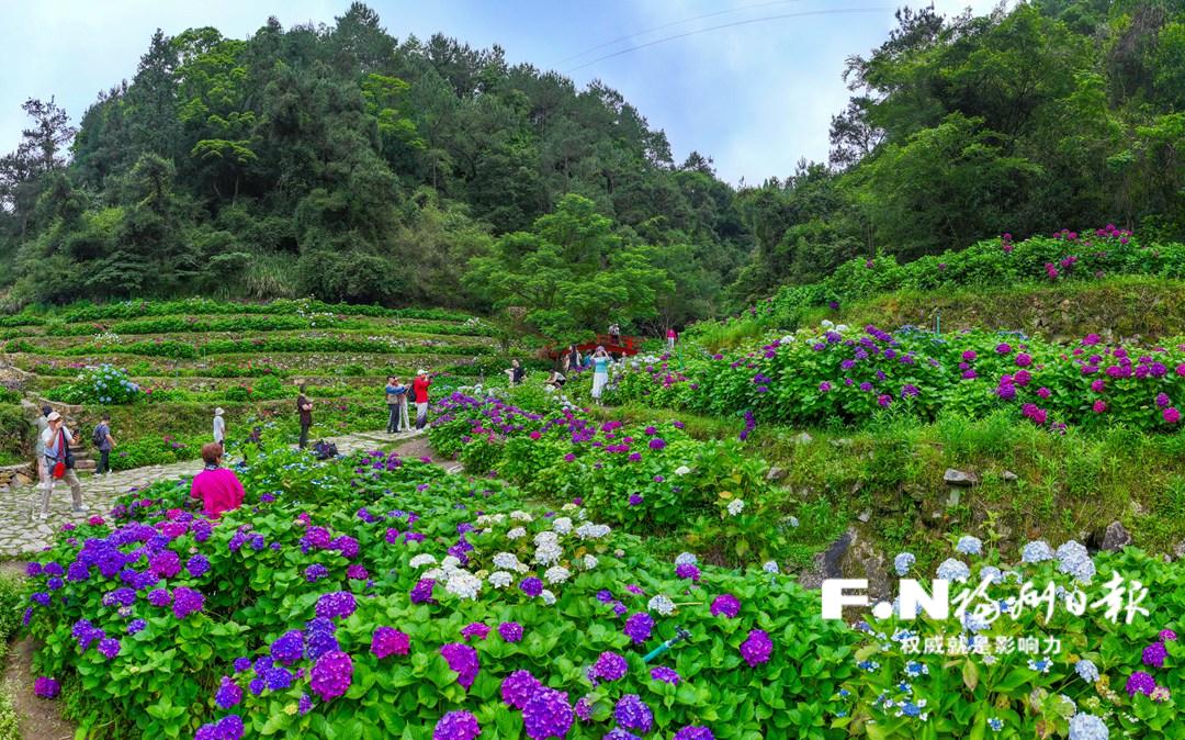 6月8日上午,鼓岭绣球花文化节开幕,游客赏绣球、看演出,逛市集,体验端午习俗,以各种方式赏尽初夏绣球风情。