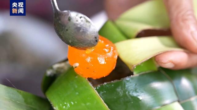 鸭乸粽填料的方法同样十分讲究。馅料需要挑选肥瘦相间的肥猪肉,经过腌制后口感肥而不腻、再挑选油脂丰富的本地咸蛋黄,用小勺子往“鸭屁股”处逐层填放。封口后,放进锅里大火熬煮两个小时,便可出锅。这样煮出来的鸭乸粽米粒分明,簕古叶和蛤蒌叶的香气扑鼻,清香可口。