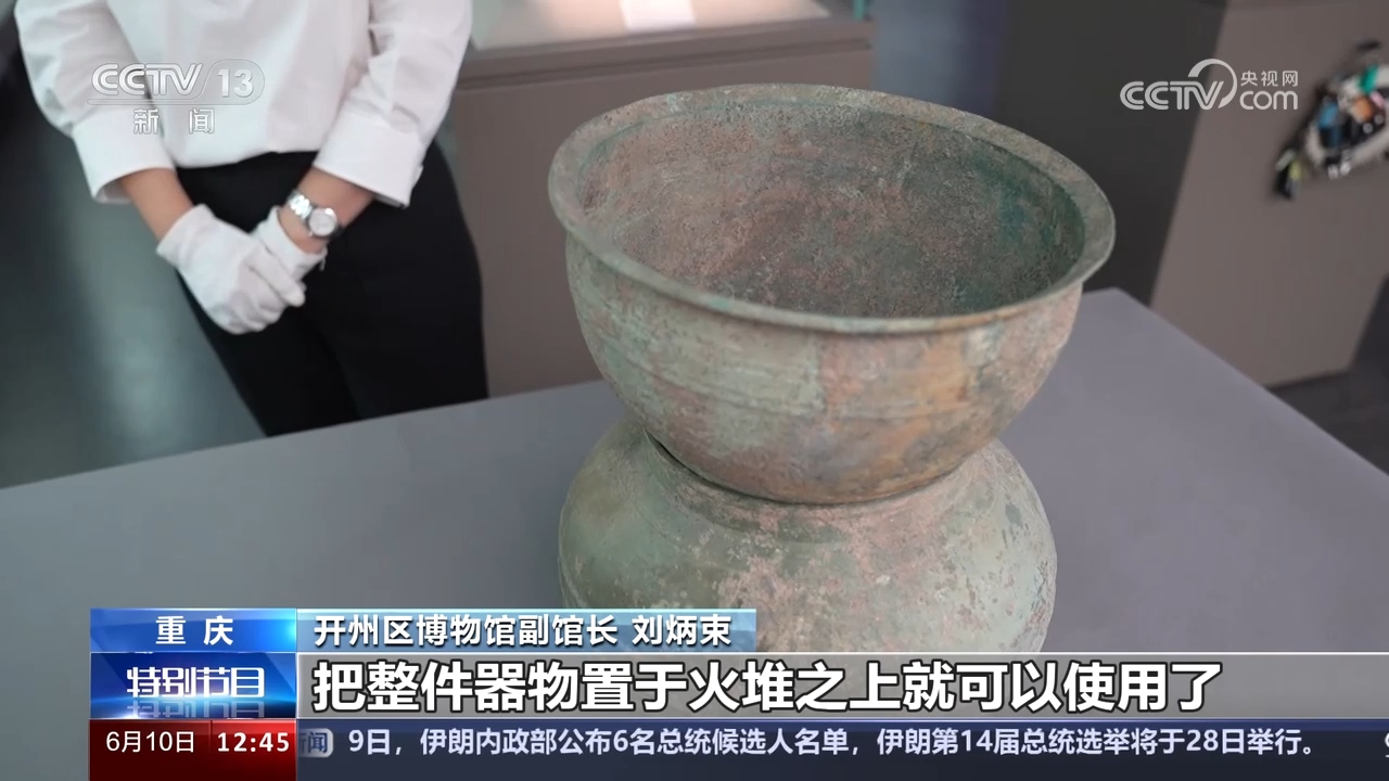 开州区博物馆副馆长刘炳束介绍,这件器物上为甑、下为釜,中间有11个大小不等的壁孔。在使用的时候把下面的釜里面装上水,然后把食物放在这个甑里面,再把这个甑置于这个釜之上,把整件器物置于火堆之上就可以使用了。在古时候,人们用树叶包裹肉食等方式蒸煮食物,与我们现代端午节蒸粽子的方式相差无几。
