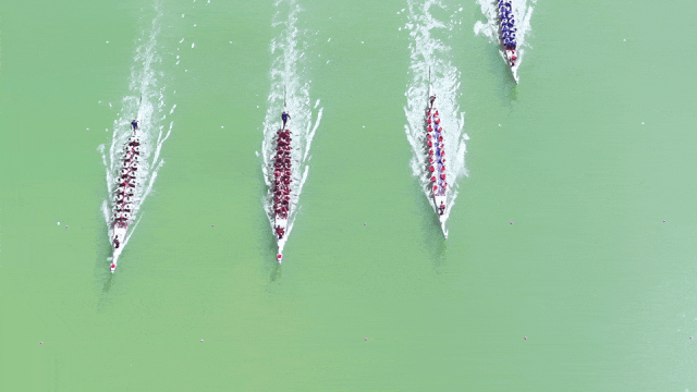 闻令而动,一艘艘龙舟如离弦之箭般冲出起点,湖面上顿时水花四溅。桨手们全力挥动船桨,他们的动作利落,整齐划一。鼓手更是情绪高亢,用力敲出鼓点,为队友们鼓舞士气,激昂的鼓声回荡在湖畔,让人热血沸腾。