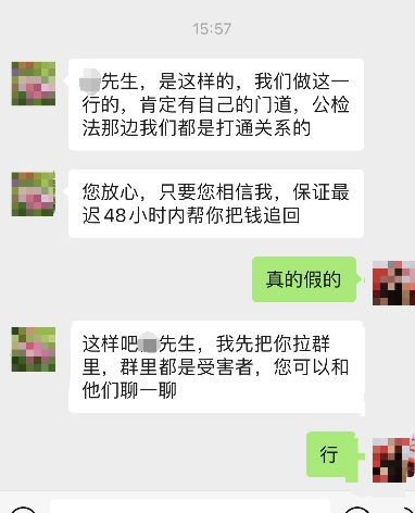 徐州铜山的胡先生(化名)经微信好友介绍,在某平台上投资了5万元,但迟迟没有收益,后来也联系不上这名微信好友。意识到被骗后,胡先生心有不甘,在网上搜索找到一名“律师”想挽回损失。“律师”称,自己有公检法的特殊门路,可以帮其找回被骗资金。
