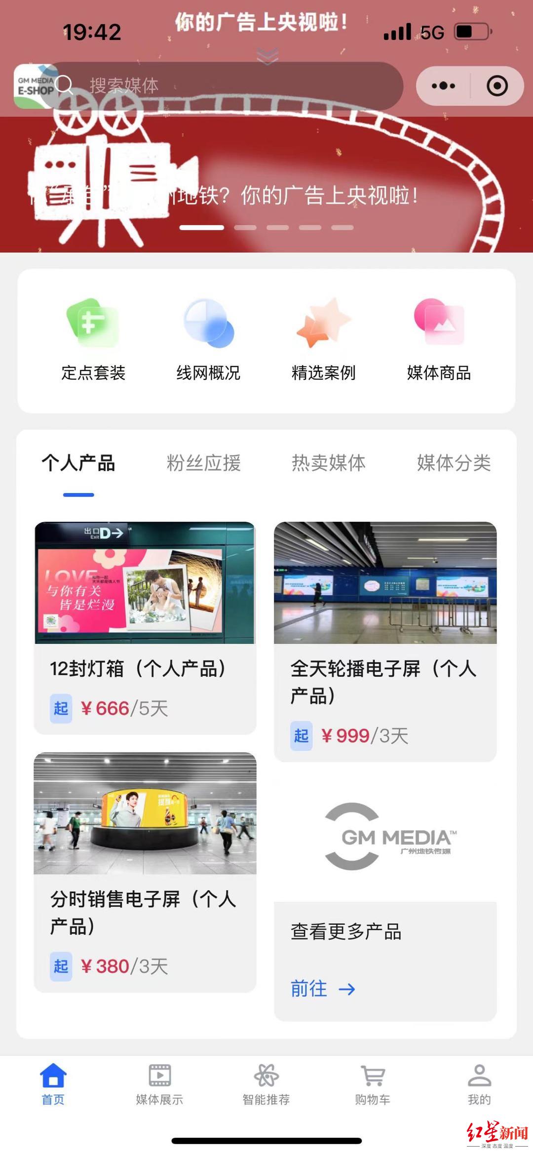 6月11日,红星新闻记者登录了“悠悠智投”微信小程序,发现其主页大致分为个人产品、粉丝应援、热卖媒体、媒体分类4种可供投放的分类选择,之后根据灯箱、站厅包柱、主题站厅等广告位置以及具体投放时间细分具体价位。其中,个人产品价格在380元至999元间,用户可选择不同地铁线路站点的各式电子屏以及投放周期,也可了解广告的平面媒体分布图、客流量以及广告投放业态分布等信息。