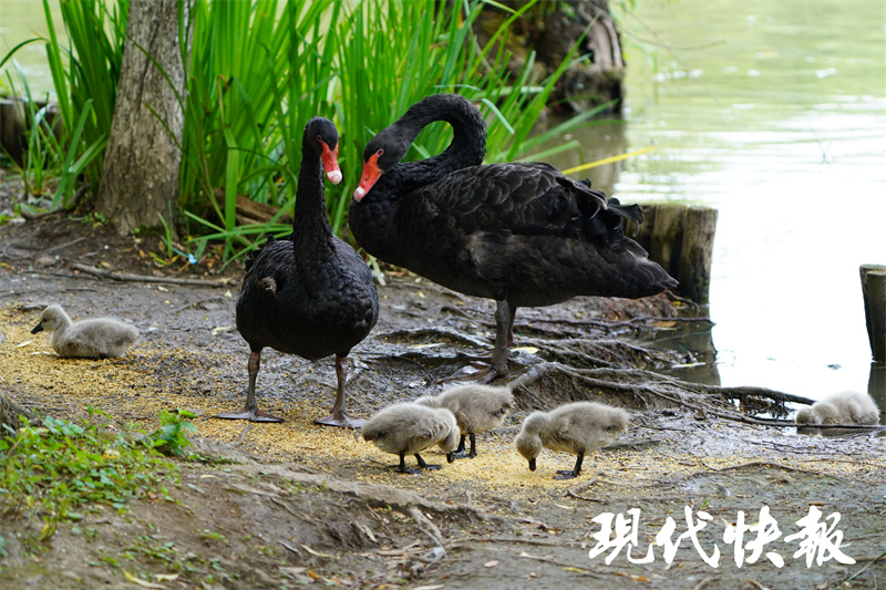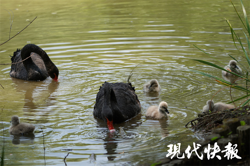 现代快报讯(通讯员武家敏记者谢喜卓)6月12日,在南京绿博园的小河里,一对黑天鹅带着出生不久的5只鹅宝宝,在水中戏水、觅食,画面十分有爱。