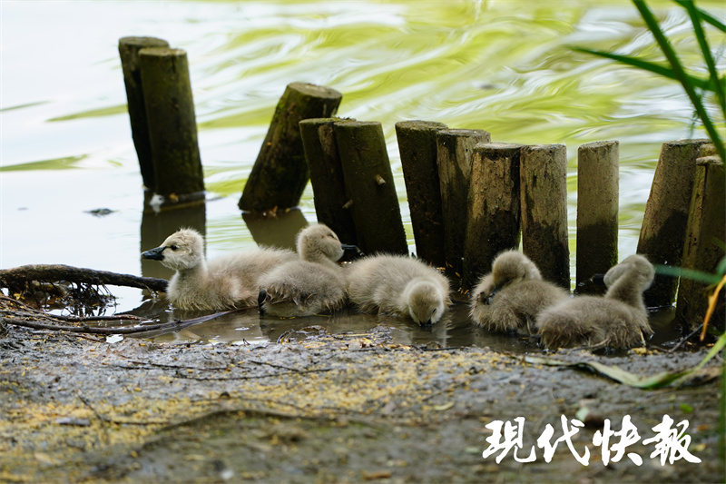 由于破壳没多久,5只黑天鹅小宝宝看起来更像灰色的小鸭子,被工作人员戏称是“丑小鸭”。5只黑天鹅小宝宝在河中游来游去,偶尔爬到岸边啄食稻穗。和谐友爱的场景,为绿博园新增一道亮丽的风景线,同时也为游客带来了观赏的乐趣。
